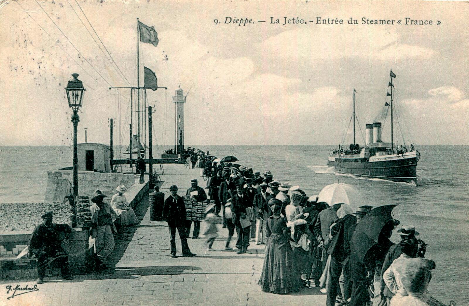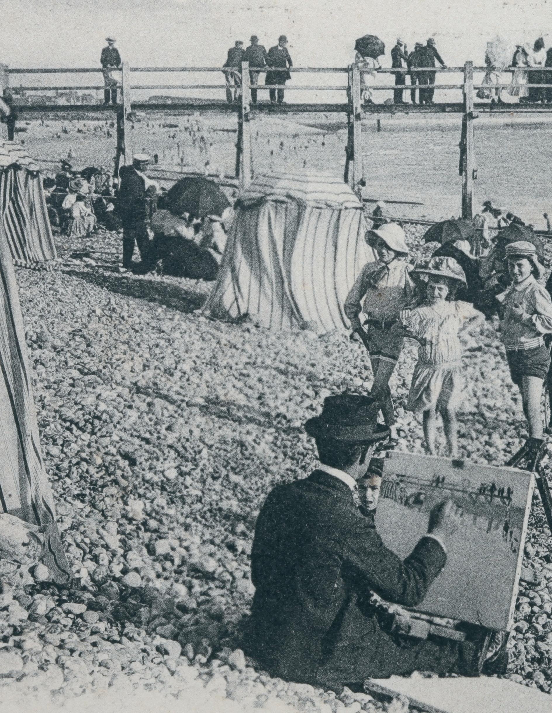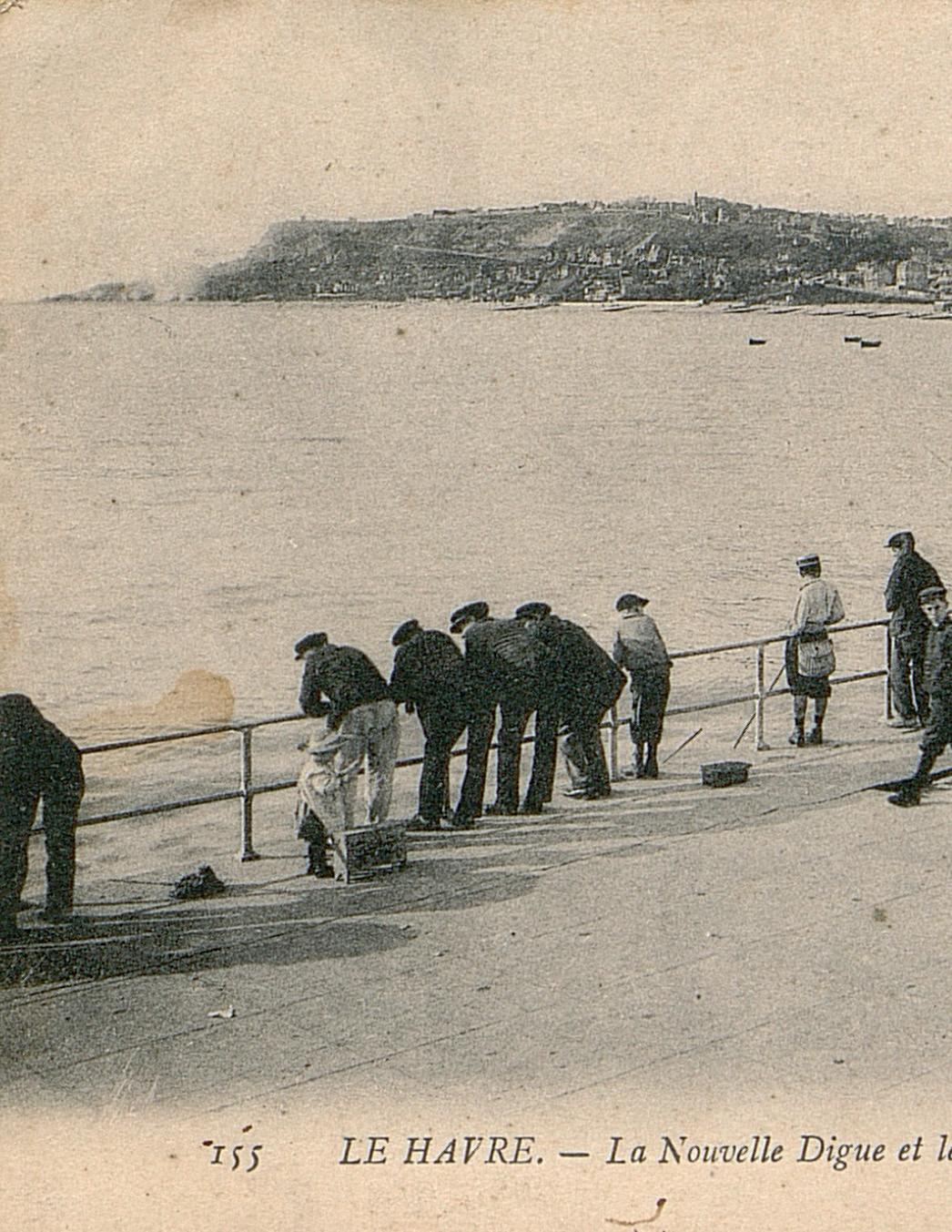 Trois ans plus tard, changement radical de décor. C’est au Havre qu’il vient, en 1906, pour exposer (à la première manifestation du cercle de l’art moderne ) et pour rejoindre son ami Raoul Dufy. Une photographie, éditée en carte postale, le montre assis sur la plage de galets, devant son chevalet, une toile en cours d’exécution. On le devine, son regard se porte plus loin vers l’estacade du casino Marie-Christine, charpente de bois qui s’avance vers la mer, servant tout aussi bien de plongeoir aux baigneurs que de point de vue pour les promeneurs. Il en a déjà esquissé les traits robustes qui forment avec l’estran un étrange angle aigu. Autour de lui des enfants, curieux, l’observent. La carte postale porte ce titre : « Sur la plage. L’Impressionniste » … En 1906, cette indication ne manque pas de saveur, mais elle rappelle que la scène balnéaire appartient au registre, non pas inventé par les impressionnistes (elle l’est un peu plus tôt), mais par contre suffisamment peint par eux, pour qu’en ces premières années du XXe siècle, elle leur soit associée.