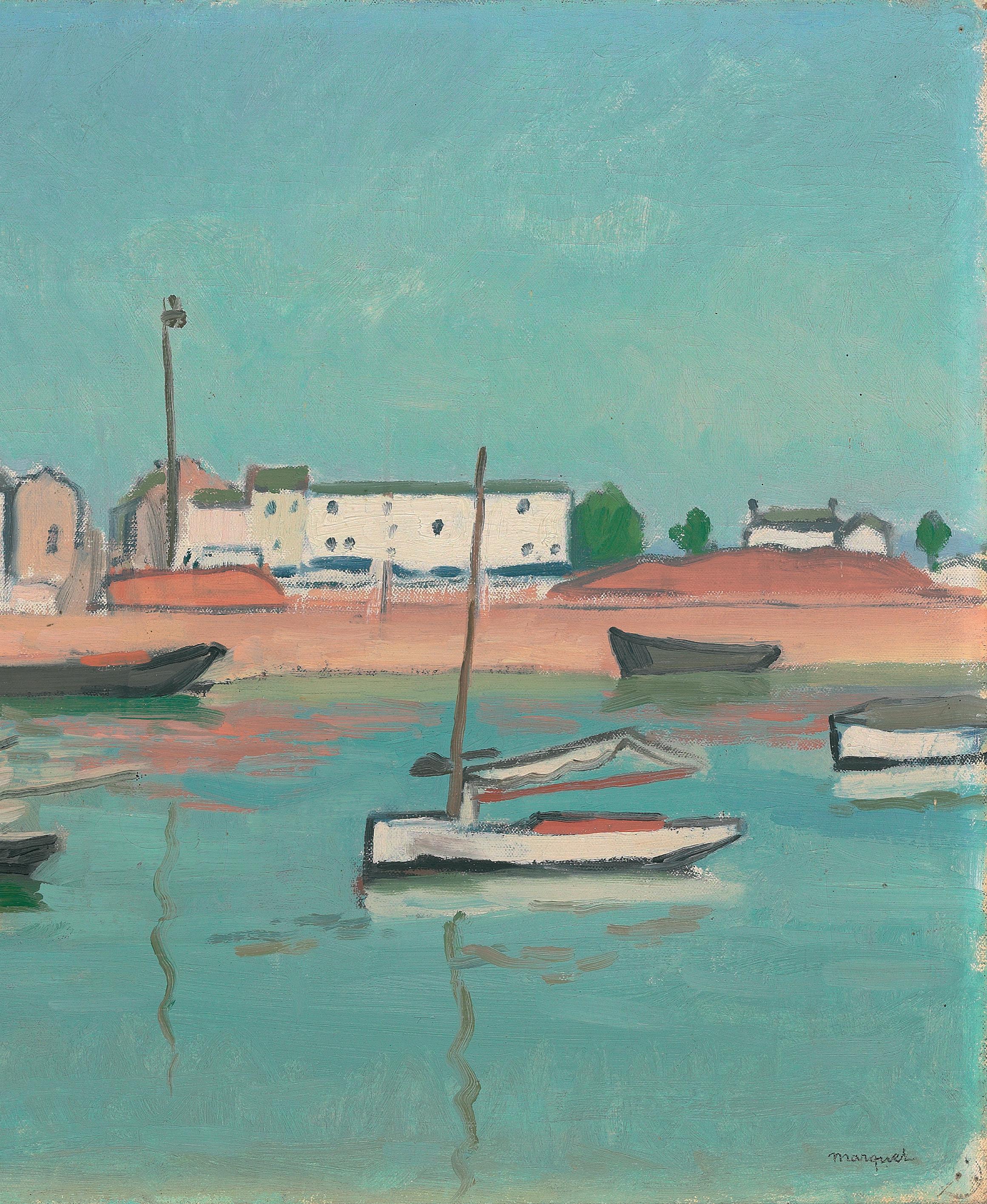 Il faudrait y ajouter une gamme de couleurs pastel tendres avec une prédilection pour les dégradés. Matisse le note : « Marquet est tout à fait réaliste, il n’interprète pas les couleurs ; il s’attache plutôt aux valeurs et aux lignes, préférant une palette de nuances de gris ou de bleu ou des atmosphères de pluie qui mettent les villes en valeur […] il sera toujours notre Hokusaï. » Trois points de vues au moins retiennent son attention : les façades des maisons sur les quais, les bassins avec des bateaux à voiles qui rappelle que c’est un petit port de pêche, et l’entrée du port avec son sémaphore et son phare
