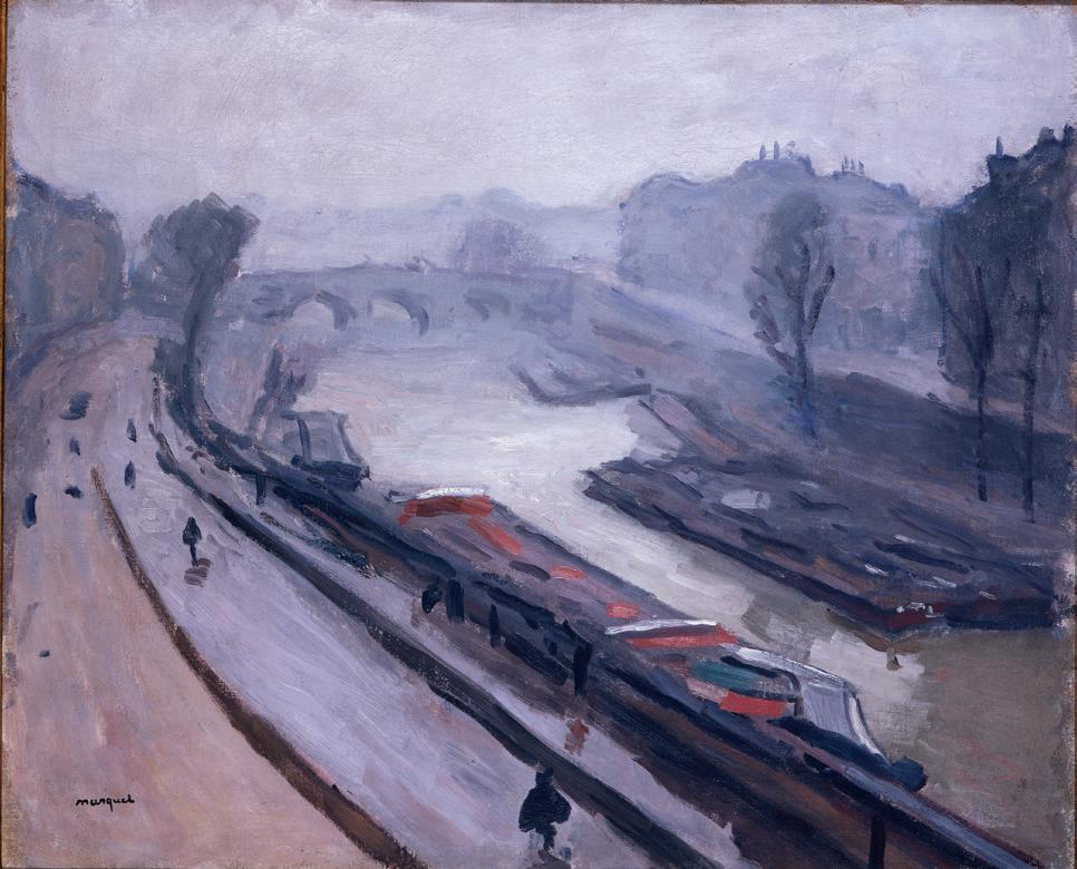 Peut-on ainsi parler d’une approche sérielle, une technique basée sur une ressemblance manifeste entre des composants qui en font partie ? Sans doute avec l’ensemble qui traite le pont transbordeur à Rouen (1912) ou celui, de la même année, qui représente le Quai de Paris, une avenue principale de cette ville . Ici, d’ailleurs, Marquet adapte la tradition impressionniste en introduisant des éléments météorologiques dans le titre : Temps de pluie ou encore Temps gris, cette dernière appellation étant pratiquement un pléonasme quand on connait la palette de l’artiste et ses harmonies sourdes. Palette qui fait justement l’éloge du gris, cette couleur intermédiaire entre le blanc et le noir, que Marquet manie en virtuose.