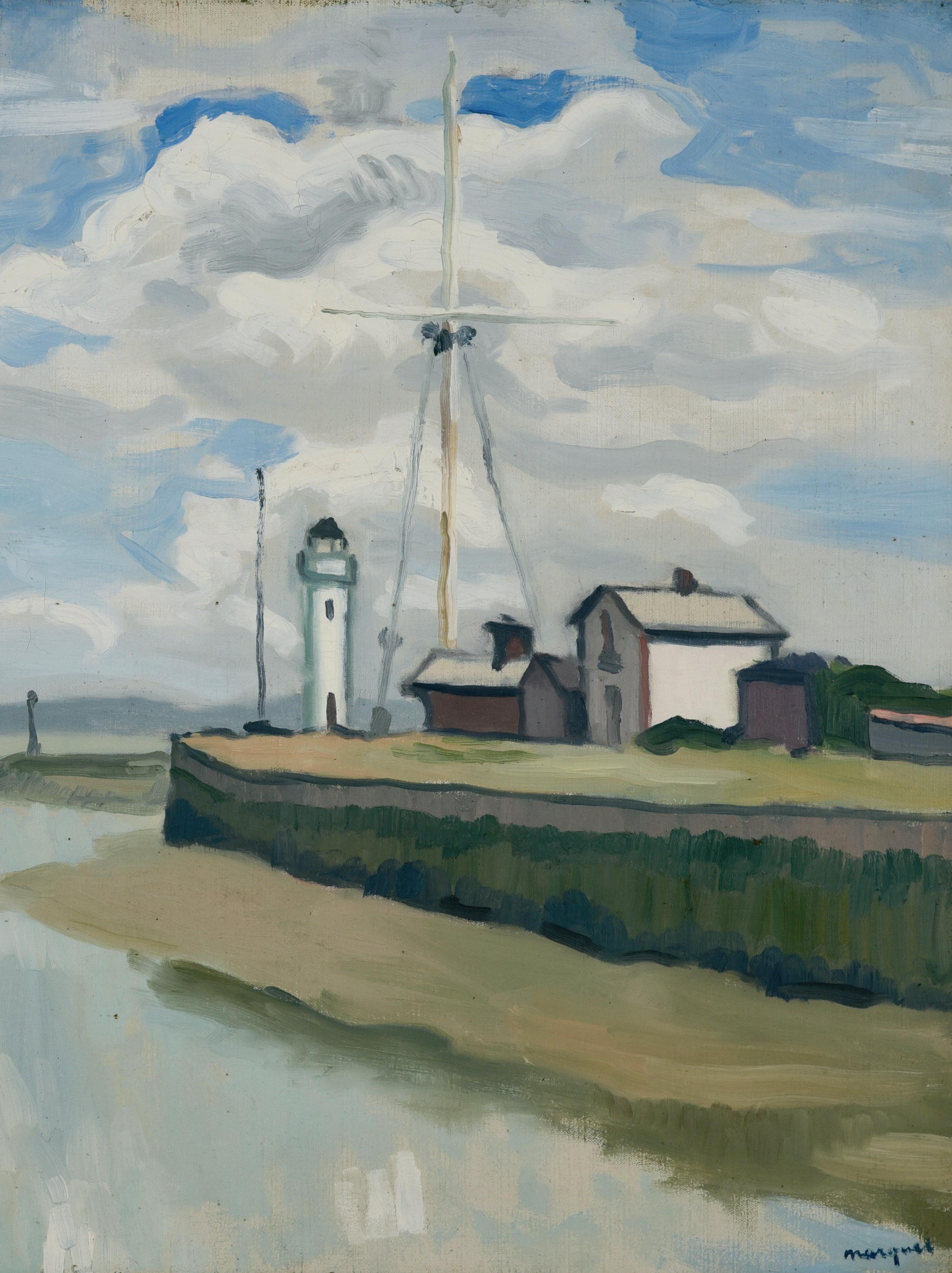 Marquet n’est pas normand. Il est né à Bordeaux dont il affectionne depuis l’enfance le port fluvial. Puis, il vient jeune homme à Paris avec sa mère pour poursuivre ses études et reste fasciné par la Seine. L’eau est un élément structurant de sa personnalité artistique. Et la Normandie à quelques encablures de son port d’attache Paris, déploie un littoral sur plus de 600 km passant de la côte d’albâtre à la côte de nacre puis au promontoire du Cotentin sans oublier la Seine, son fleuve chéri. Il passera ponctuellement par tous ces territoires maritimes dans le premier quart du XXe siècle. Pourtant, il lui faudra aussi la camaraderie des peintres en particulier fauves ou de critiques amis pour franchir le pas et l’inciter à séjourner en Normandie. Là, à l’affût du motif, il observe et synthétise. « Il ne corrigea pas le paysage, ne le composa pas : il en saisit la synthèse » comme le dit Emil Scittya . L’eau qui n’est jamais une étendue uniforme mais toujours agitée par un clapotis ou par la houle domine ses compositions. Et avec elle, le port, la plage, la ville et les humains qui les peuplent. Marquet effectue plusieurs séjours : le premier passé inaperçu en 1903 en compagnie de la famille Manguin à la Percaillerie à côté de Flamanville, le second en 1906 avec Raoul Dufy au Havre d’où ils partent sillonner la côte de Dieppe, Fécamp, Le Havre, Honfleur jusqu’à Trouville. La troisième fois, il revient à Honfleur en 1911 aux côtés de Vallotton puis un quatrième séjour à Rouen l’année suivante avec Matisse qui vient le chercher pour partir vers le sud. Après un long intermède dû à la guerre, il revient à Vieux-Port, puis Canteleu près de Rouen en 1927 sur la suggestion de Signac et pousse jusqu’à Honfleur et enfin la sixième et dernière fois à nouveau au Havre et brièvement à Dieppe en 1934. Dès le début des années 20, le peintre séjourne à la belle saison à Paris et passe l’hiver à Alger.