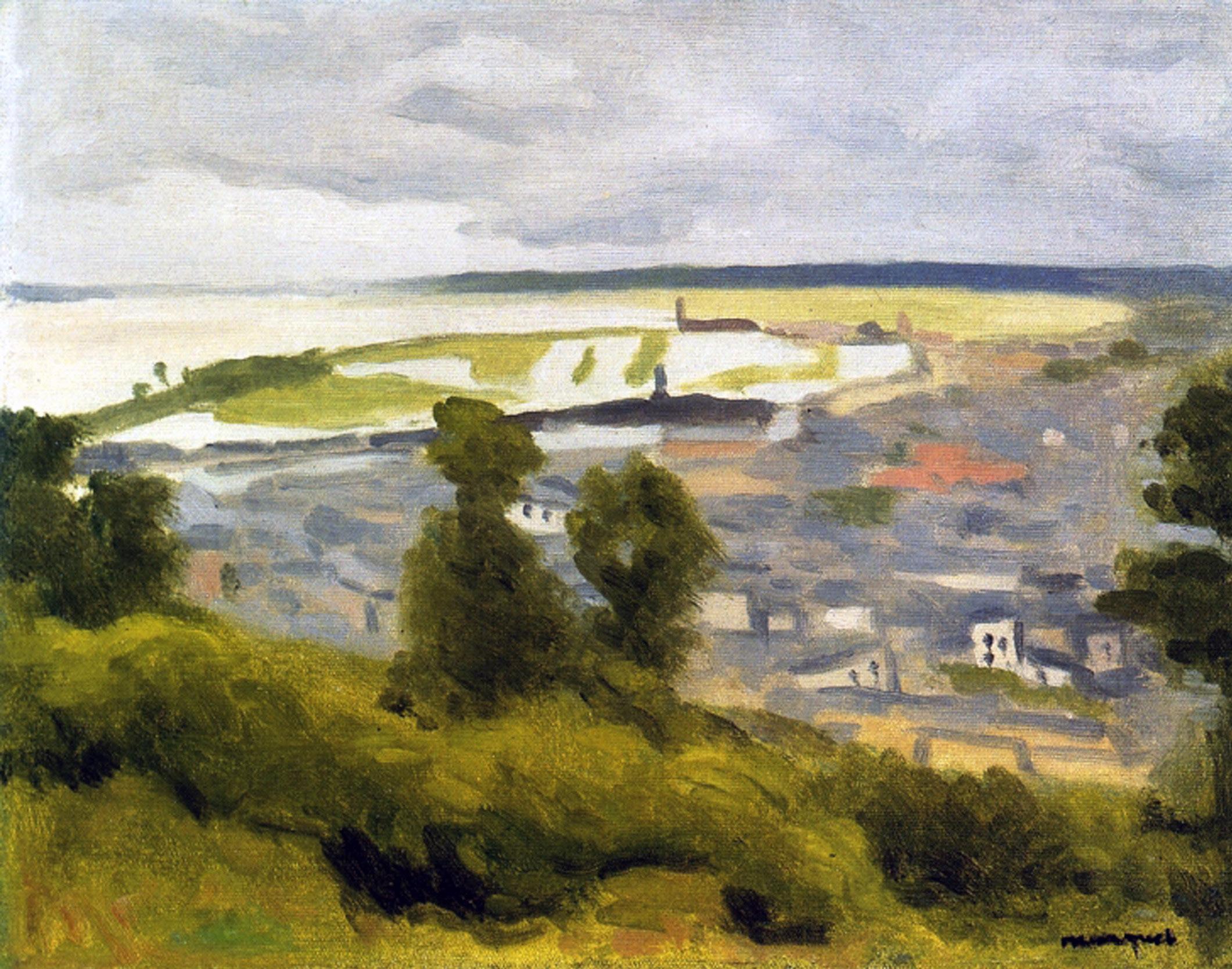 Il est de nouveau à Rouen en 1927, cette fois du haut de Canteleu où il a trouvé un hôtel, il peint une série de vue surplombant Rouen d’où l’on aperçoit au fond, perdus dans la brume le port et la ville. Rouen de 1927 fait immanquablement penser au port d’Alger qu’il peint dans les années trente. De même, lors de son dernier séjour au Havre, on voit comment la flotte a évolué. Il s’intéresse aux cargos, aux remorqueurs et aux docks comme plus tard à Alger, tel un journal de bord, à la flotte alliée avec ses cuirassiers à quai se préparant aux batailles navales. S’il conserve son sens de la synthèse, le mystère et la surprise de ces premiers tableaux se sont évaporés. Georges Besson a remarqué cette légère évolution : « Des œuvres récentes ont perdu la simplicité élémentaire des peintures ancienne, pour gagner, s’il est possible, en décision et en subtilité. […] suprême connaissance d’un métier […]. » Il peint aussi d’autres ports moins tourmentés comme Honfleur dont il saisit le calme et la douceur. Il le découvre en 1906 avec Dufy puis y revient en 1911 où il rencontre Félix Vallotton qui s’y est installé depuis longtemps. Ce dernier fait partie de cette génération liée au symbolisme que fréquente Marquet. Ce n’est seulement pour leurs idées anarcho-sociales qu’ils partagent, mais aussi pour leur passion comme de l’estampe japonaise. Même si la grande mode du Japonisme est passée, Marquet reste marqué et attaché à cet héritage : ce goût pour l’ellipse, la transcription à la fois nette et simplifiée des formes, l’adoption d’une perspective à vol d’oiseau dû à sa position en surplomb et d’un cadrage inhabituel.