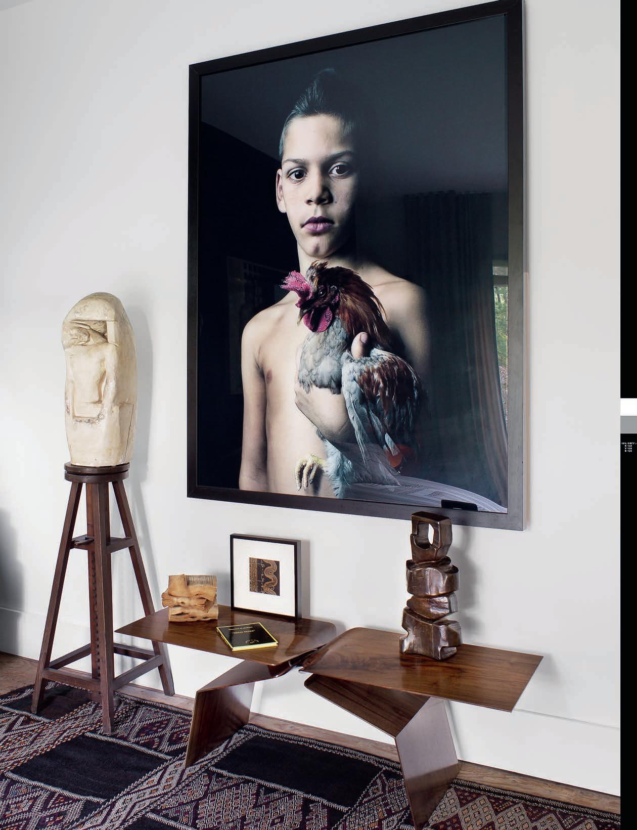 living room shot by Jean-Francois Jaussaud is the centerpiece of his bedroom in Sullivan County, New York, where it hangs over a modern dresser by the British designer Gareth Neal, which is flanked on each side by Napoleon III chairs The composition is enhanced by the room’s patterned wood flooring, gifted to him by another dealer and reminiscent of French seventeenth and eighteenth-century examples