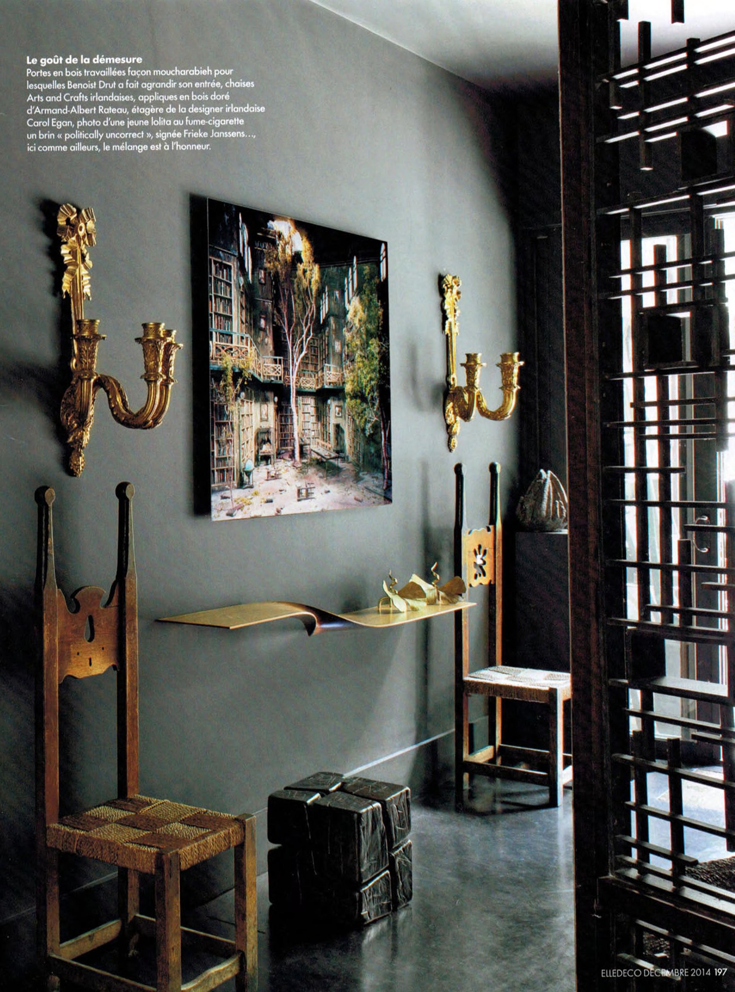 Portes en bois travaillées facon moucharabieh pour lesquelles Benoist Drut a fait agrandir son entrée, chaises Arts and Crafts irlandaises, appliques en bois doré d'Armand-Albert Rateau, étagére de la designer irlandaise