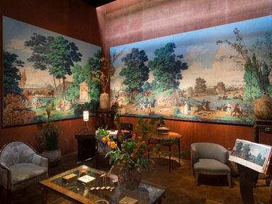 Four large panels of Les Chasses de Compiègne, a rare early-19th-century scenic panoramic discovered by Thibaut-Pomerantz, are displayed on the booth’s tobacco-brown suede walls, resembling picture windows overlooking a wooded landscape where an aristocratic hunt is in progress. The honey-gold parquet de Versailles floor hosts some of Maison Gerard’s choicest offerings, including a sensuous 1920s Émile-Jacques Ruhlmann fauteuil and a low-slung circa-1960 James Mont sofa upholstered in