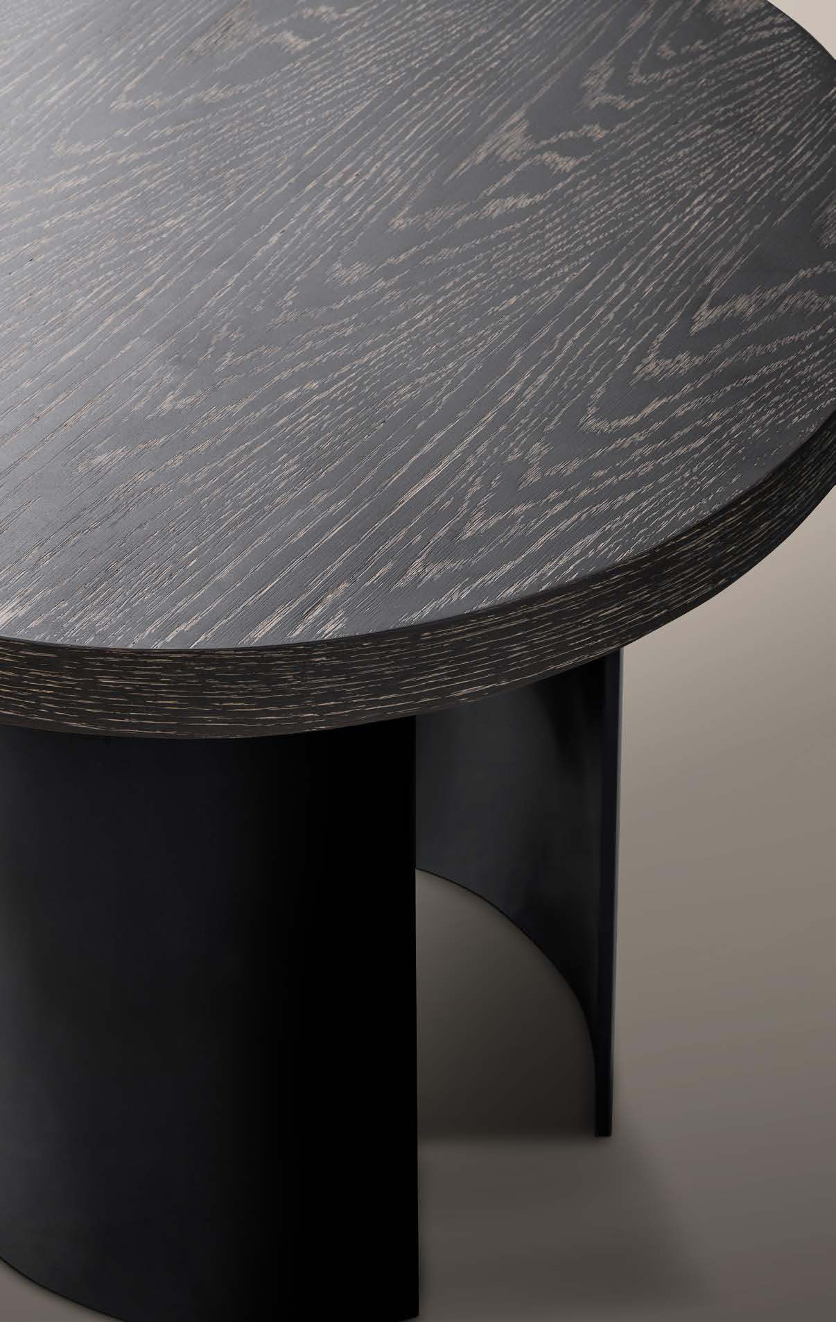 The Archer is the harmonious interplay of masterfully juxtaposed graphic metal lines against natural wood elements. The legs are crafted from solid, cold-rolled steel offering a heavyweight foundation that contrasts beautifully with the softer contours of the wood top. The metal curves are designed to cast captivating shadows and highlights, enhancing the depth and allure of each piece.