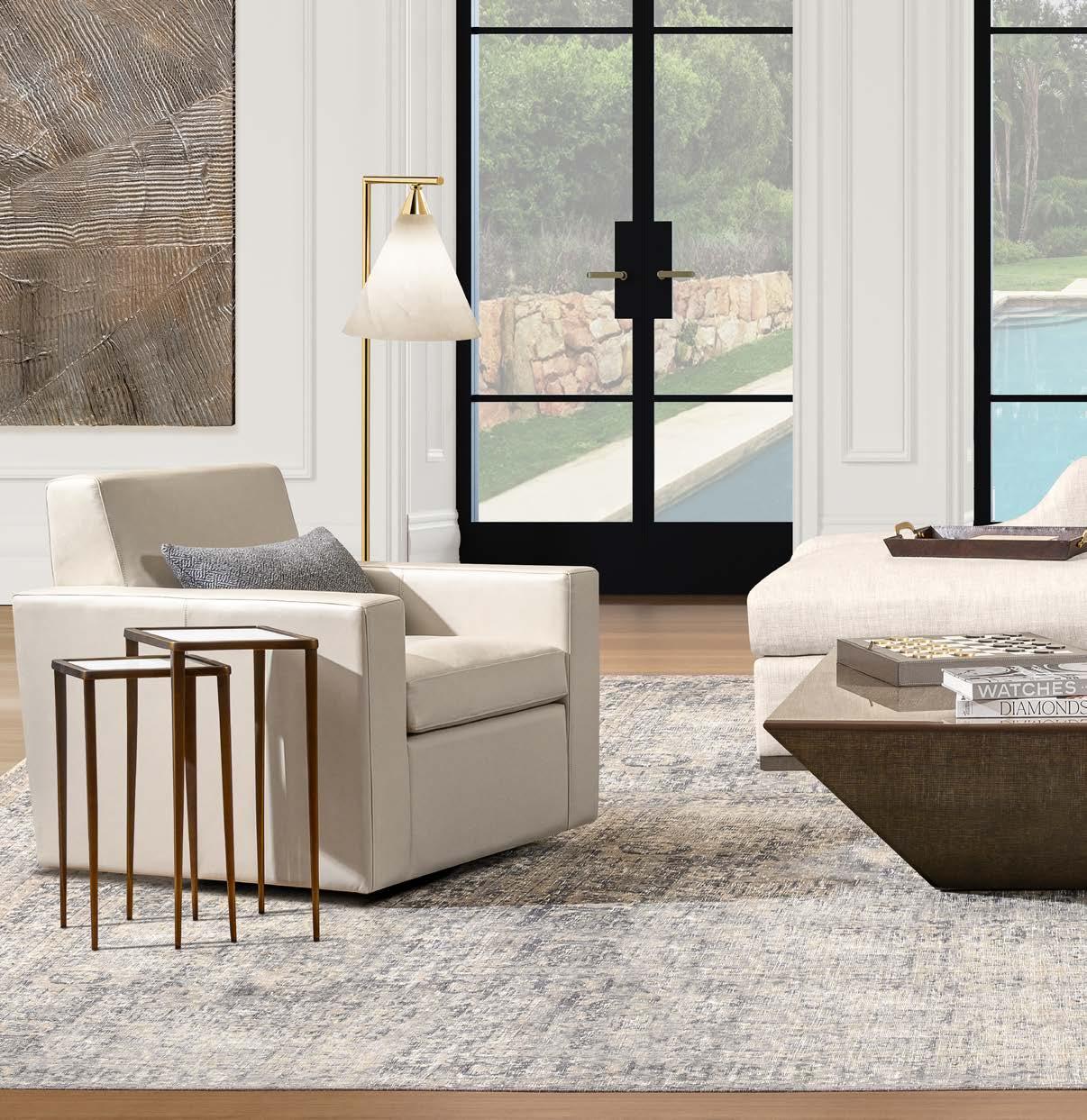 CASARES RUG IN STEEL starting at $3,560 COLETTE MODULAR SECTIONAL IN CLASSIC LINEN SAND starting at $2,190 NOBLE LEATHER SWIVEL CHAIR IN SADDLE PARCHMENT starting at $5,600 ECHO COFFEE TABLE IN WALNUT SUNSET LACQUER starting at $3,150 ESKER NESTING TABLES IN BRONZE starting at $2,350 MANHATTAN FLOOR LAMP IN ALABASTER & BRASS starting at $4,010 KALEIDOSCOPE SILVER & GOLD BY SARA ABBOTT starting at $4,875 RIBBED CASHMERE THROW IN IVORY starting at $650 DISTRESSED TEXTURED WEAVE PILLOW IN HEATHER starting at $225 BASKETWEAVE PILLOW IN SILVER staring at $160 CHEVRON PILLOW IN SILVER starting at $160 BASKETWEAVE PILLOW IN SAND starting at $160 CHECKERS BOARD GAME IN GREY starting at $990 LUCIA WOOD POT Starting at $290 JUNO WOOD POT starting at $270 VESTA WOOD POT starting at $250 CADE LEATHER SERVING TRAY IN CHOCOLATE starting at $220