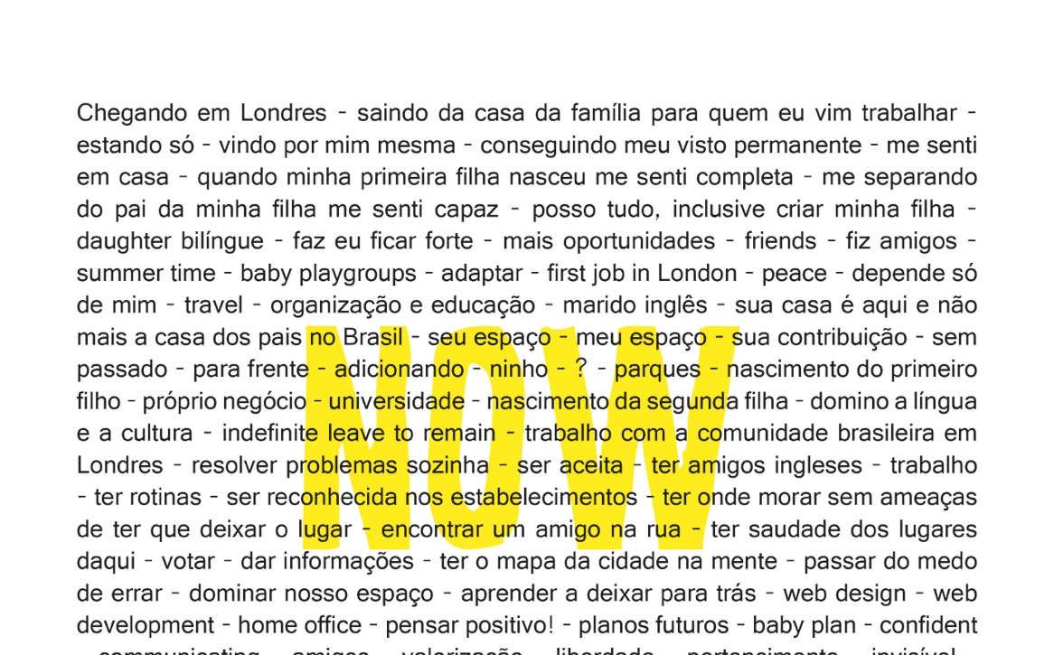 When taking part in this research, you will be contributing to the comprehension of the phenomenon studied, to the production of artistic and scientific knowledge, and to the building of a collective place of visibility for the stories on language and place told by Brazilian women living in London.