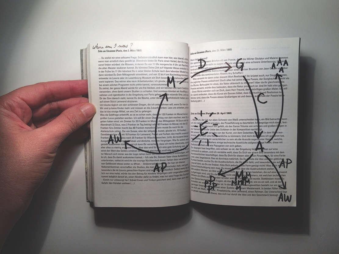 Chapter 4 is called Mapping traces for tracing a map and consists of one section, 4.1 Routes of dispersion, in which I look at my practice in retrospect and present it through a schematic map, offering a view on the results of this research. In chapter 5, Moving on, I conclude this practice-based research.