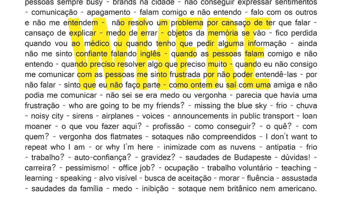 My art practice is central to this research methodology and combines two elements: (1) an individual practice as response to personal experiences of displacement and dislocation in language, through which I develop artworks and unfold methods for investigating life stories told by other Brazilian women; and (2) a collective writing practice experienced in a convivial place by using the methods created in the first stage of the research.