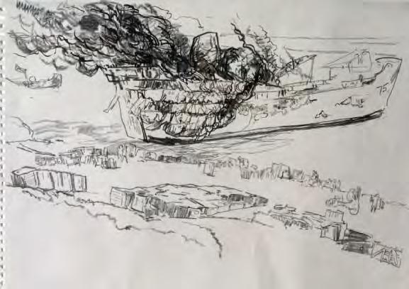 Linda Kitson, Sir Galahad Moored at Fitzroy, 1982, conte crayon and oil pastel on paper, 29.5 x 42 cm, published in http://www.iwm.org.uk/collections/item/object/15400, accessed 30/1/2012