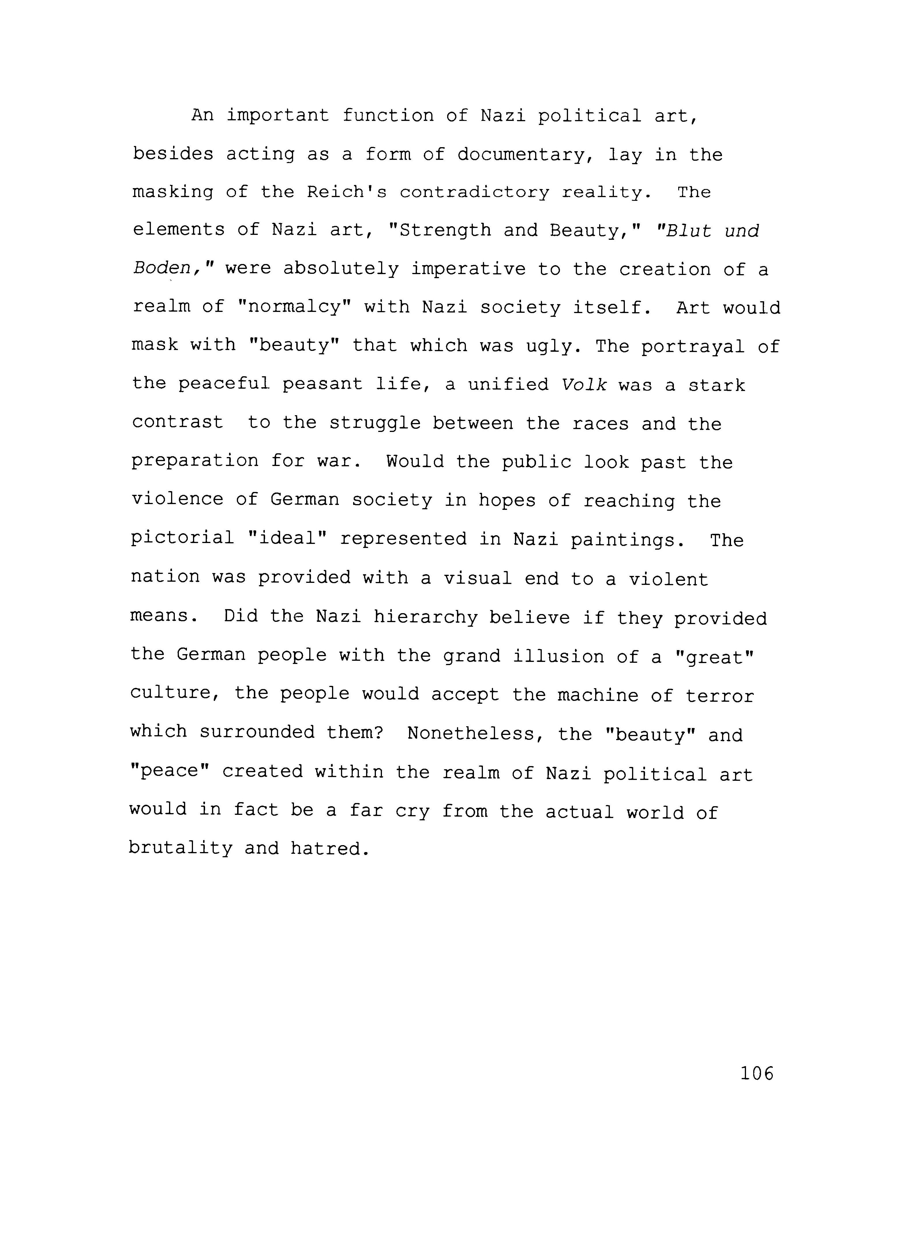 Within the realm of politics one must classify Nazi art, art commissioned by the government of the Third Reich. The commitment the National Socialists had to the arts is in fact great, when we consider the brutal physical violence perpetrated by the state, and its fixation with action and great deeds. Nonetheless, the Nazis went to great lengths to turn the German art world upside down in the name of "beauty." Key National Socialist concepts such as strength, Blut und Boden, the spirit and essence, the racial ideal, would all be elements of this Nazi definition of "beauty." 5 This aesthetic expressed the values of traditional German militarism, as many historians have written, and the Nazi racial state. 6 Nazi political art exemplified