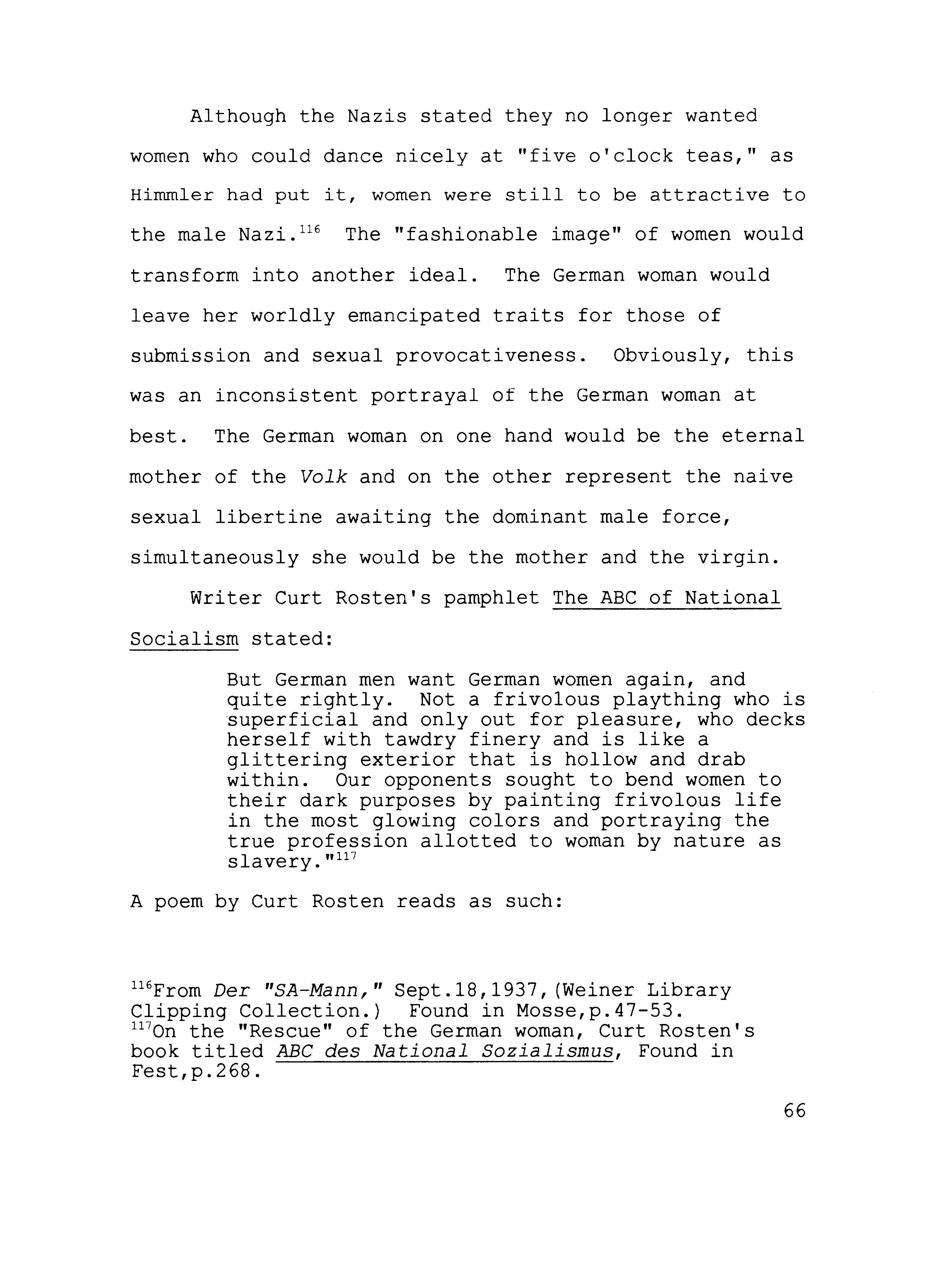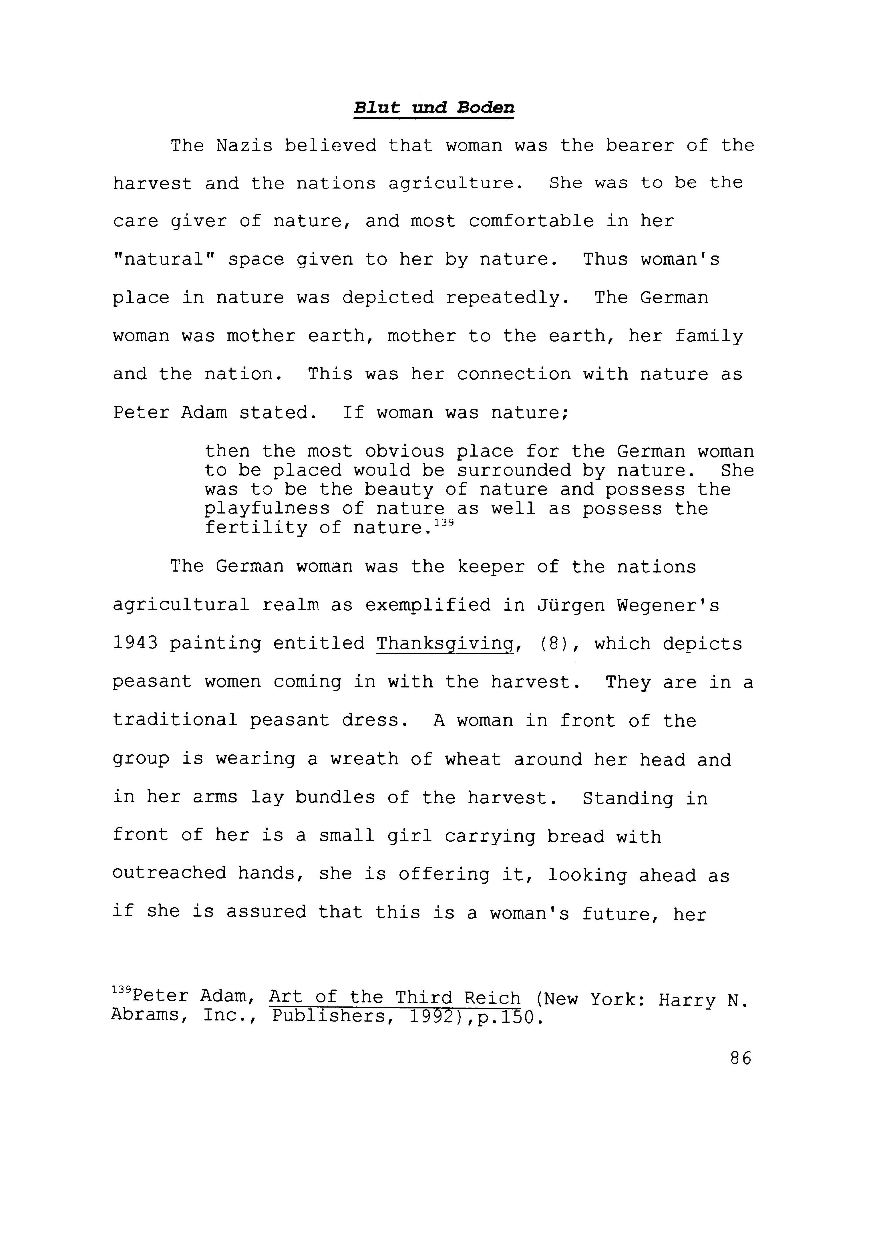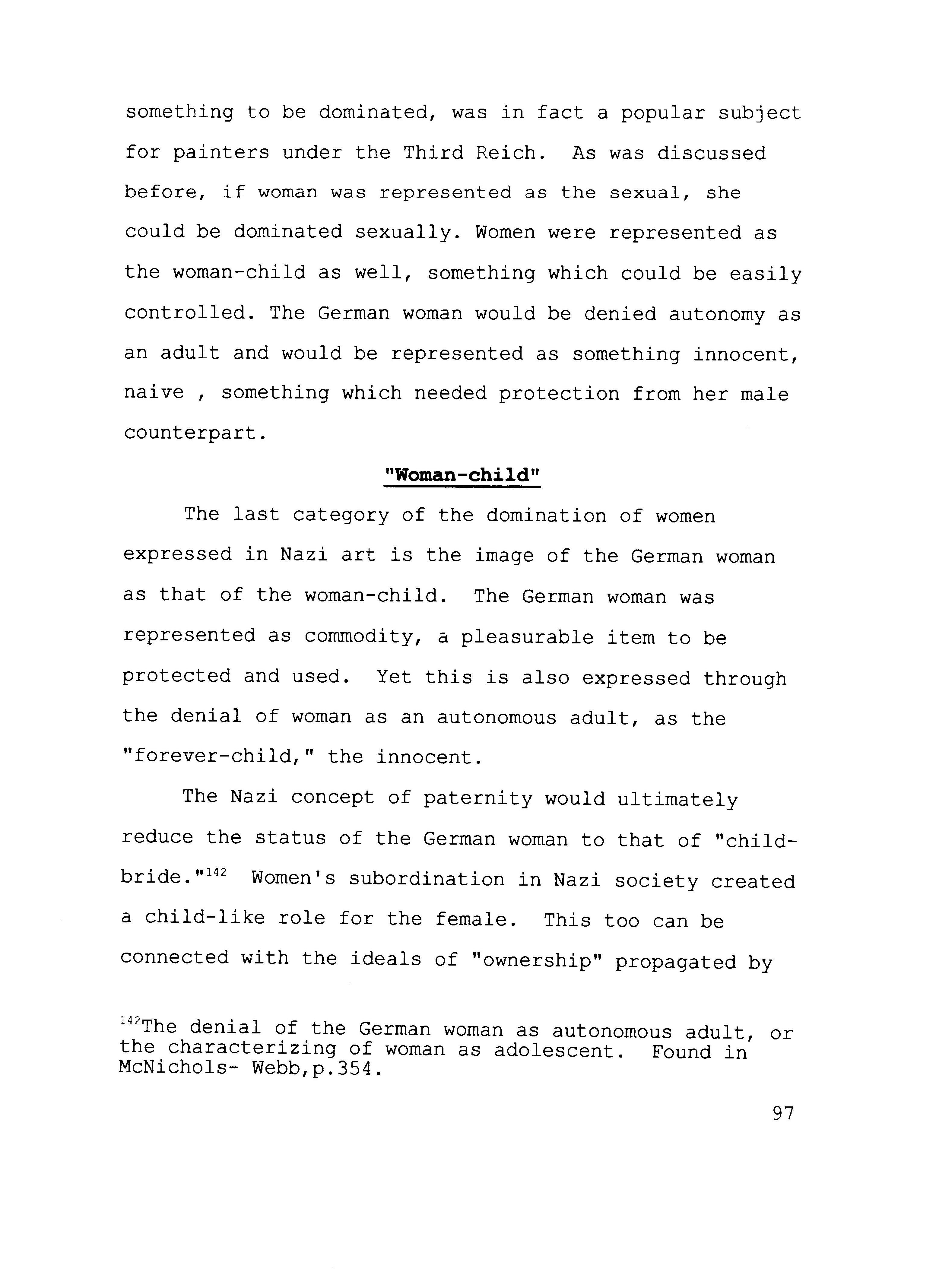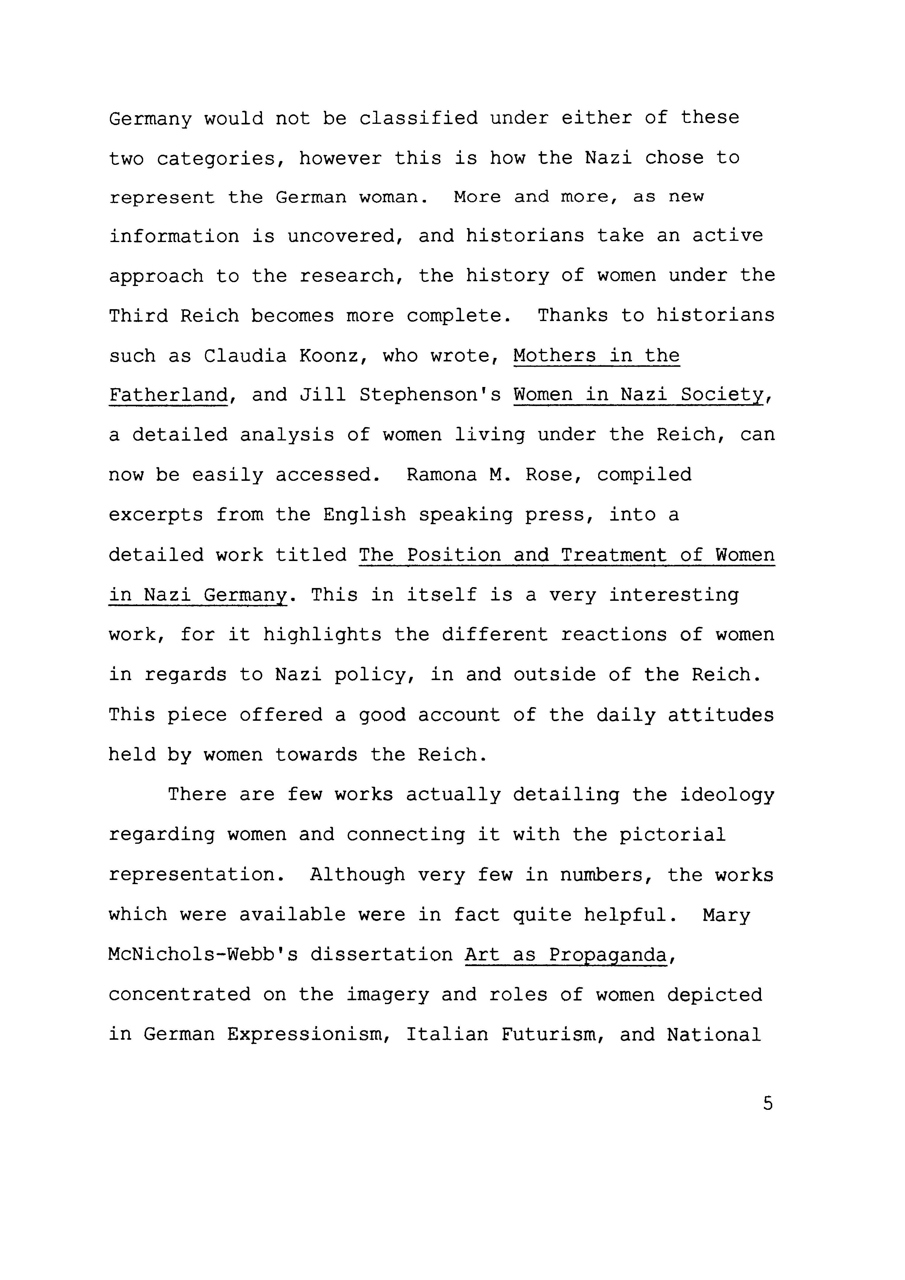 This study combines two elements of National Socialism, ideology expressed through art and the creation of the new German woman. Because of this, it was necessary to research the underlying thematic dogma surrounding women under the Reich. Women have often been portrayed as the fervorant followers of Adolf Hitler, or as the quiet Hausfrau relegated to her realm of domesticity. Much of the female population of