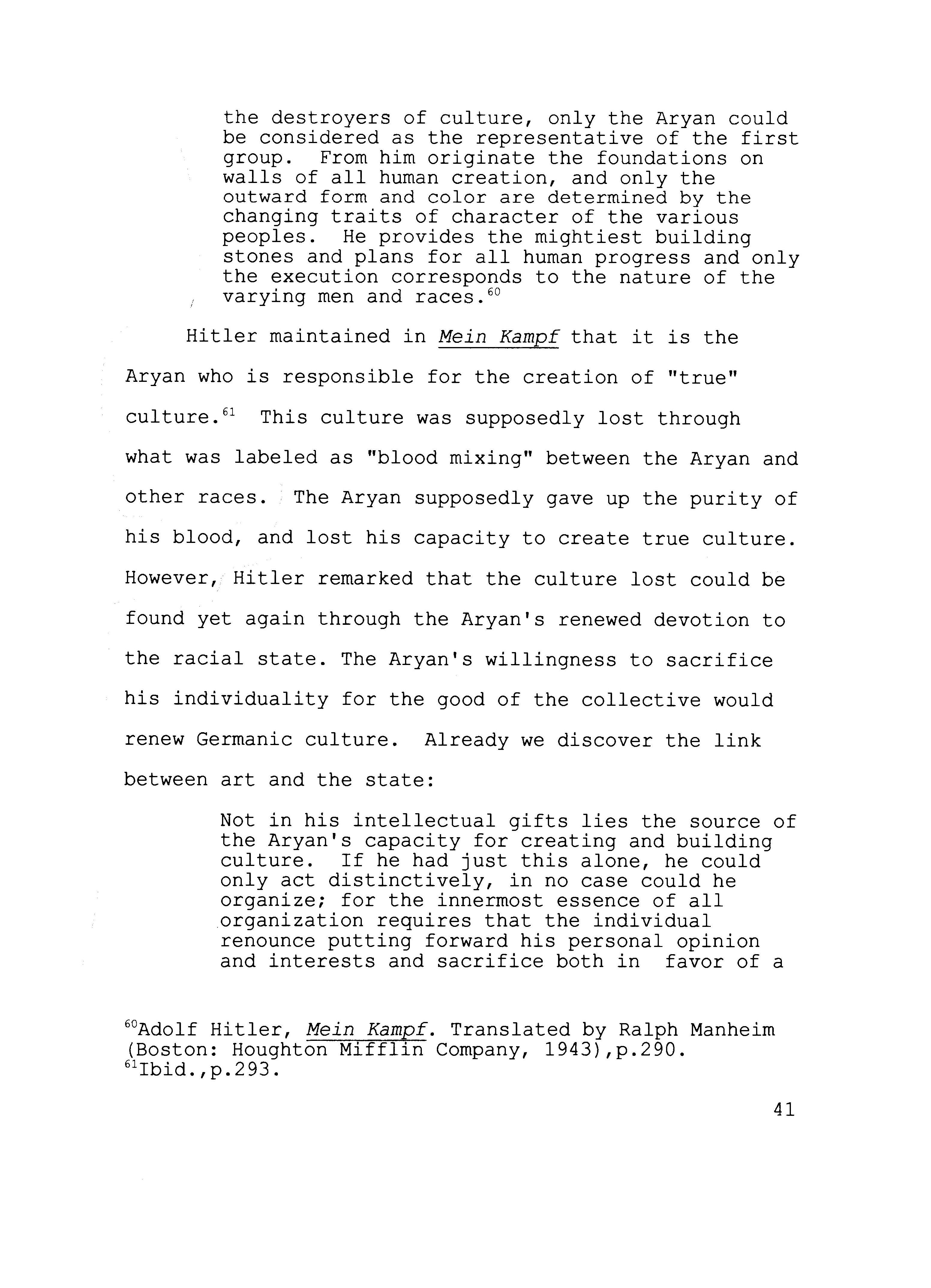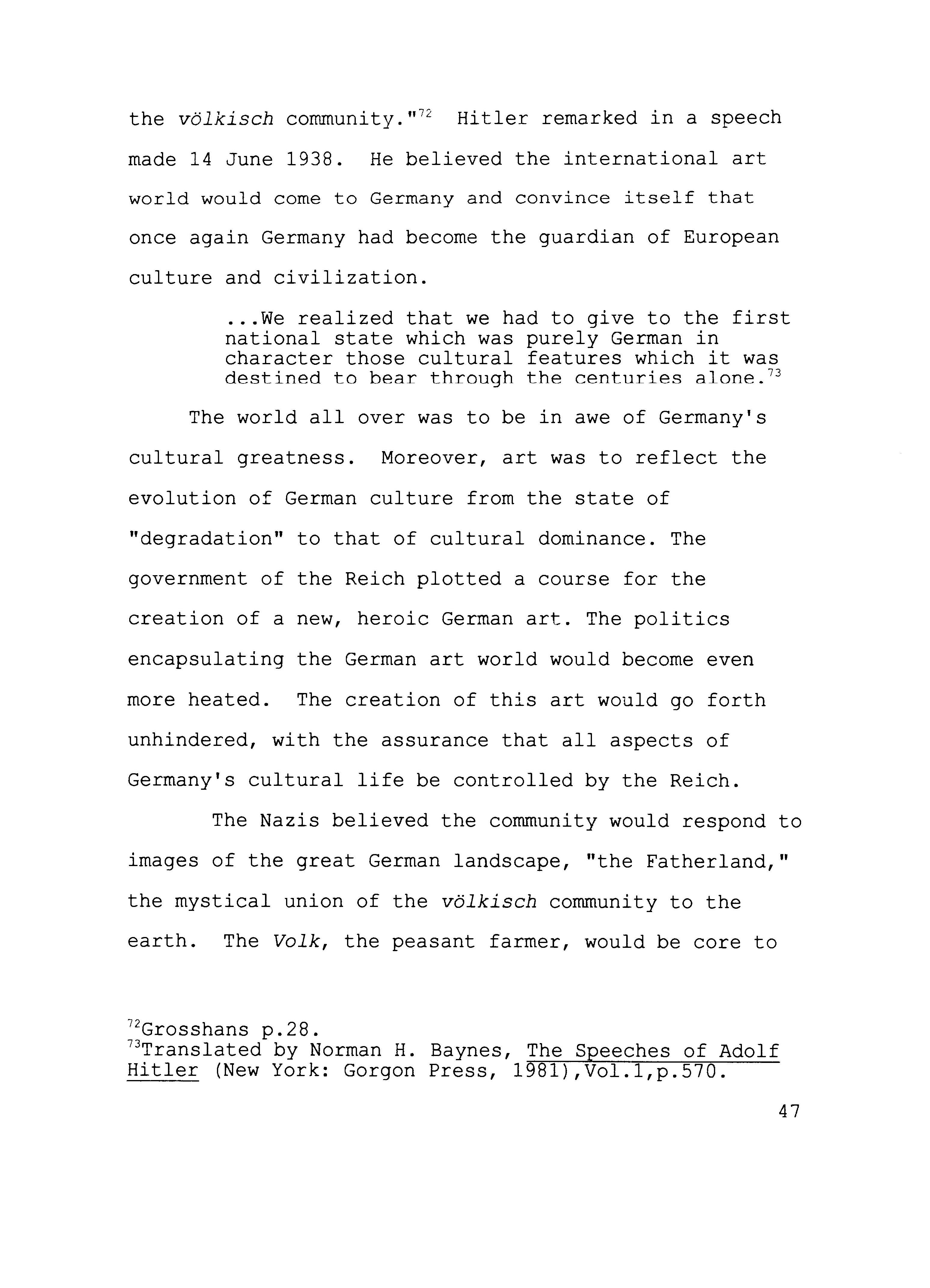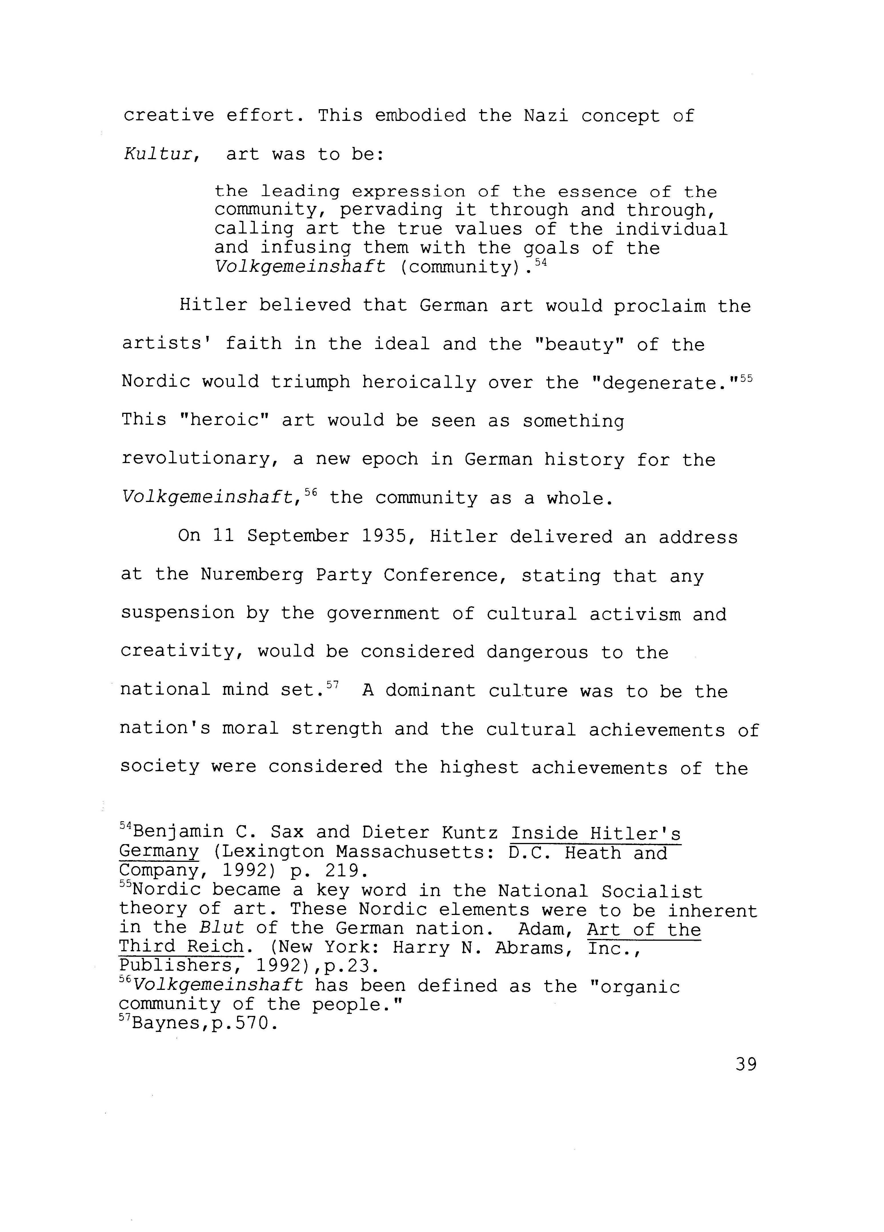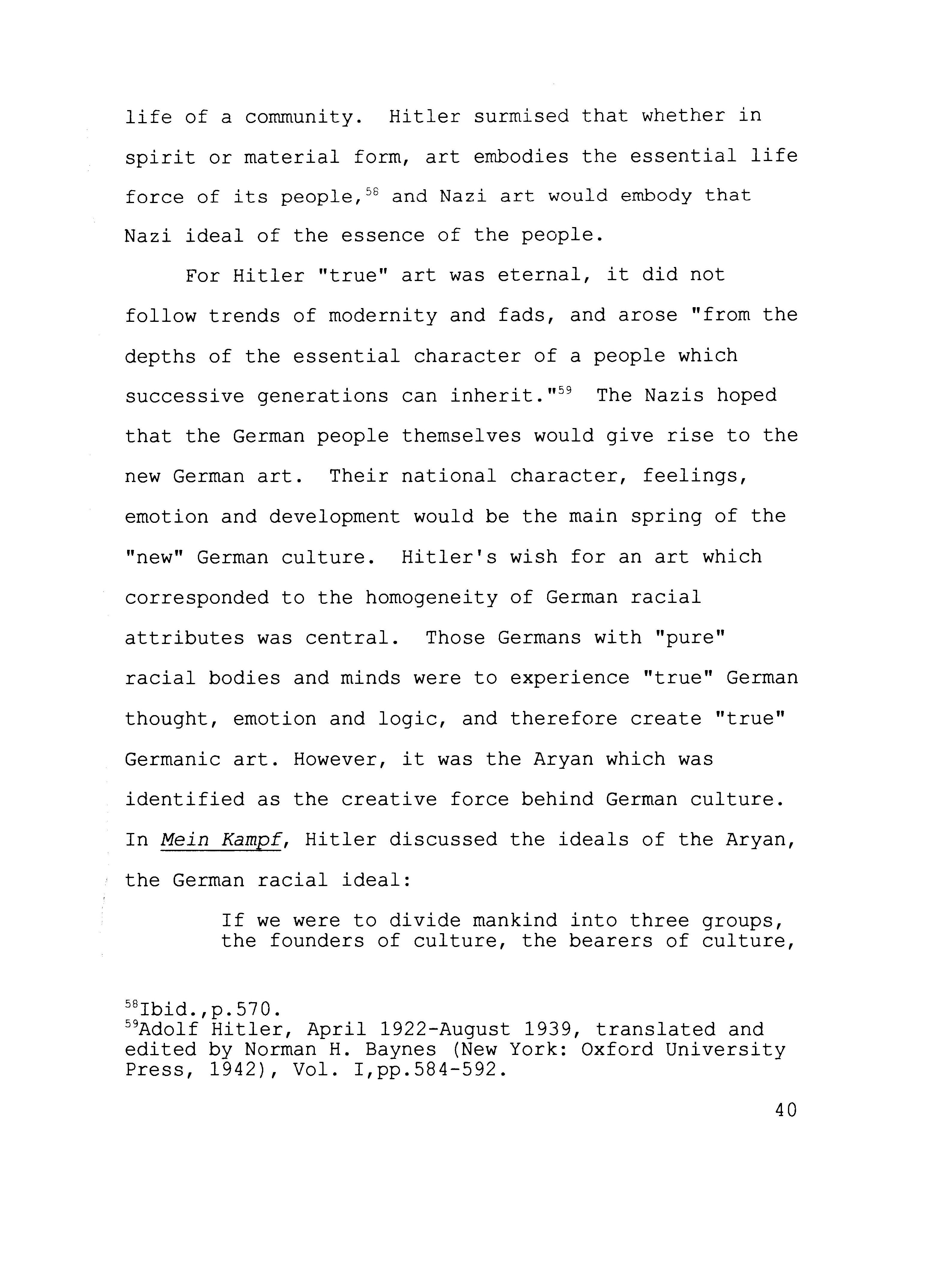 Hinz dives deeply into the study of one painting in particular which has been used many times over, to articulate the ideology concerning women. His study of The Judgement of Paris, proves vital in the understanding of ideology in official art. Adam provides necessary information, uncovering the fate of official art after the Allies storm Berlin in 1945. Much of the art was destroyed, however, Adam discusses the confiscation of the art after the war, and where it was held under lock and key for many years after. Art and Power, Europe under the Dictator's 19301945, a compilation, provides a useful generalized study of art under the European dictator's from 1930-1945. The work focuses on the development of a political aesthetic in Nazi Germany. This compilation did provide a few primary resources, one in particular, is a speech made by Hitler at the opening of the Great German Art Exhibit of 1937. This primary source was invaluable in understanding Nazi cultural ideology and policy. Mein Kampf proved useful in the understanding of Nazi ideology, and the crux of Hitler's cultural beliefs. A source which no student of German history should be with out is the compilation of Hitler's speeches, translated by Norman H. Baynes. Other works providing necessary