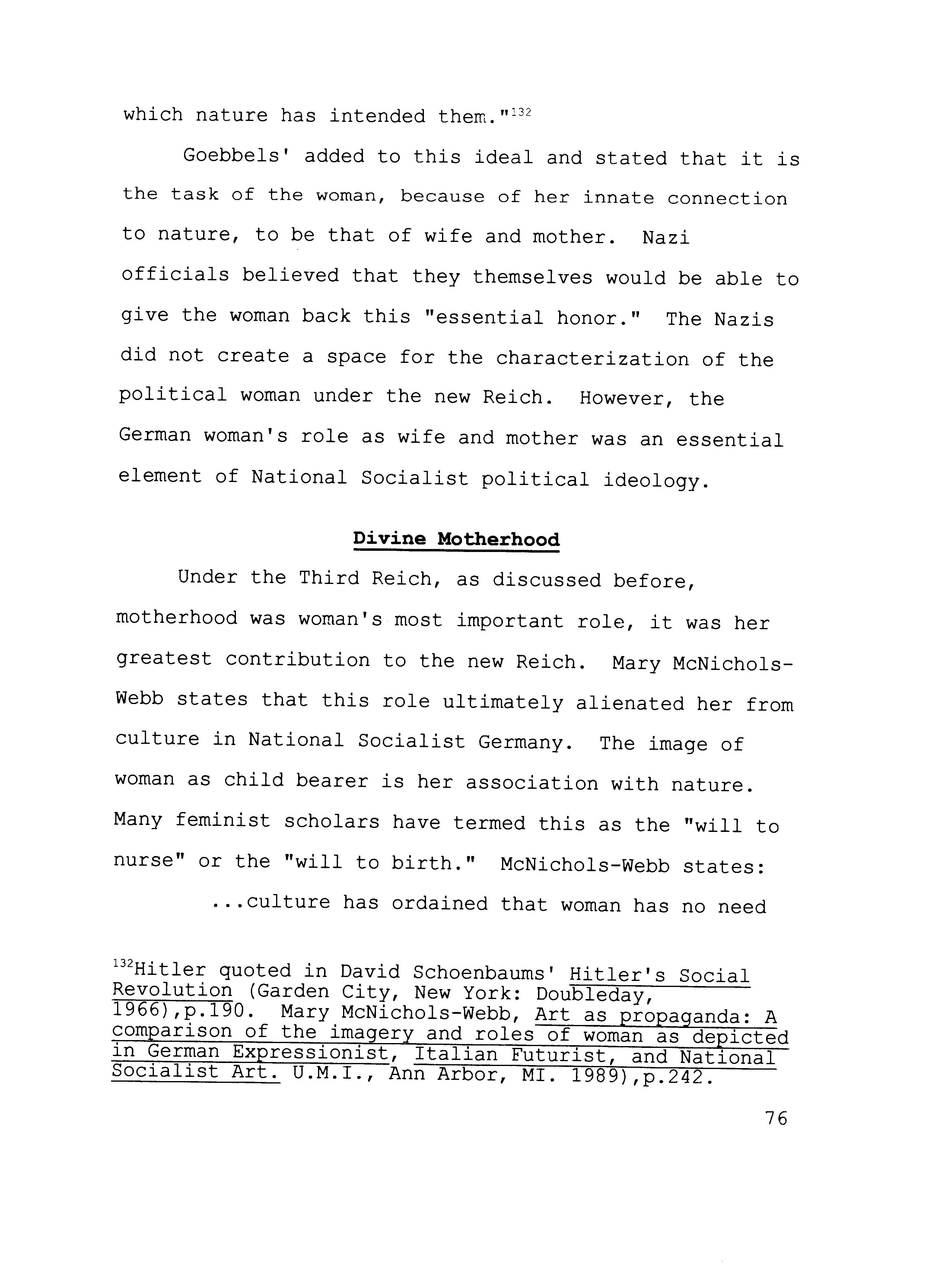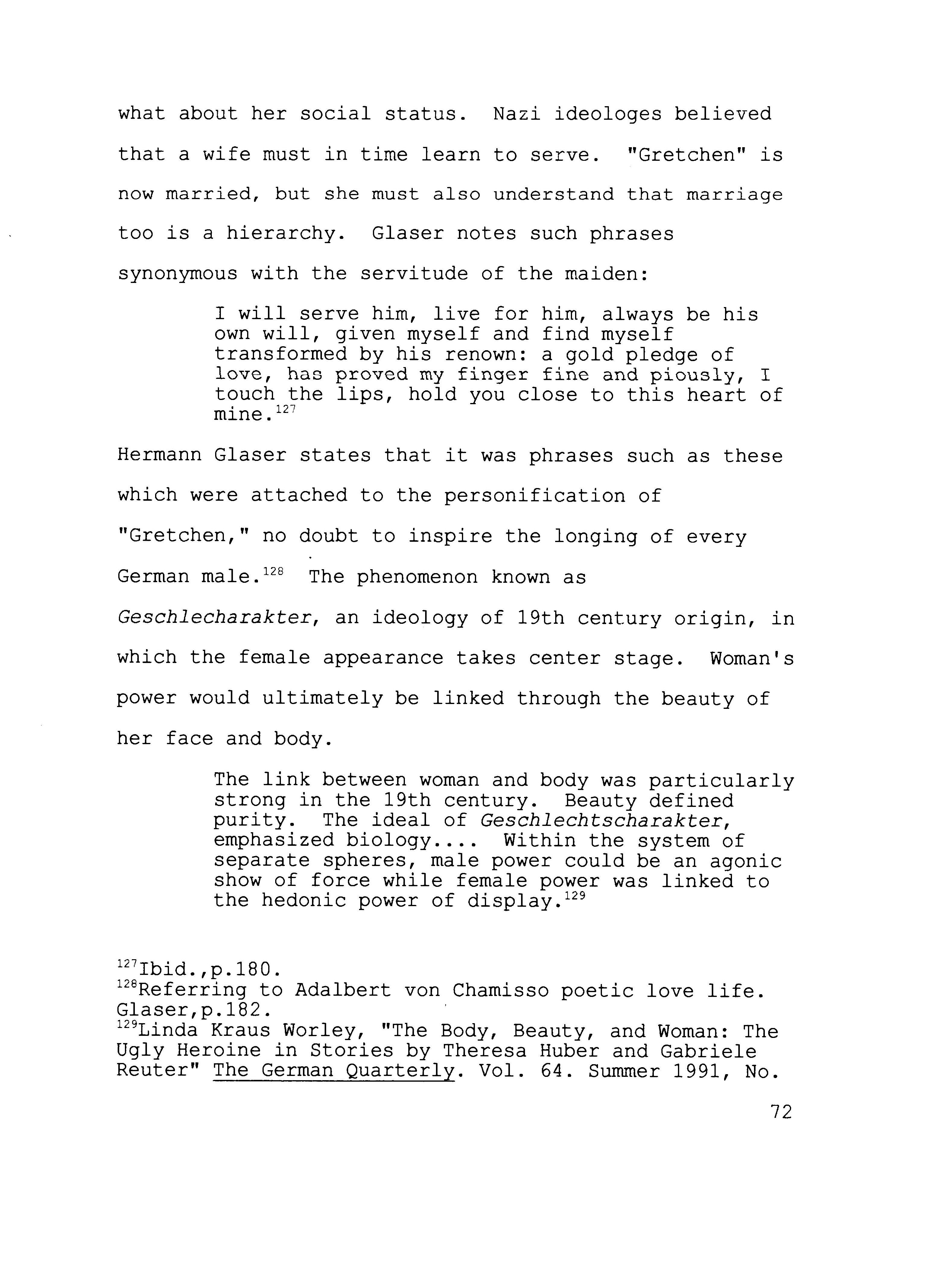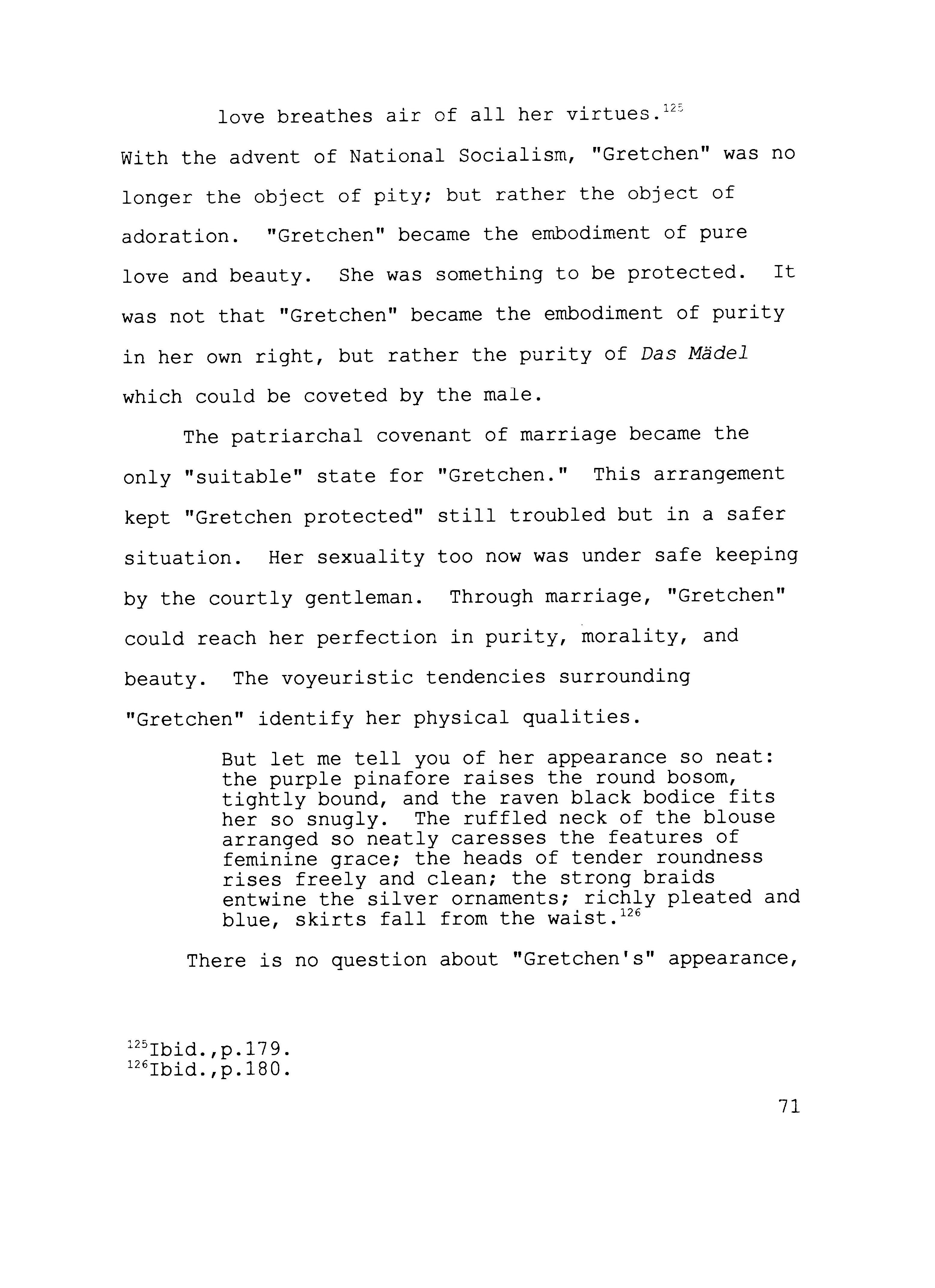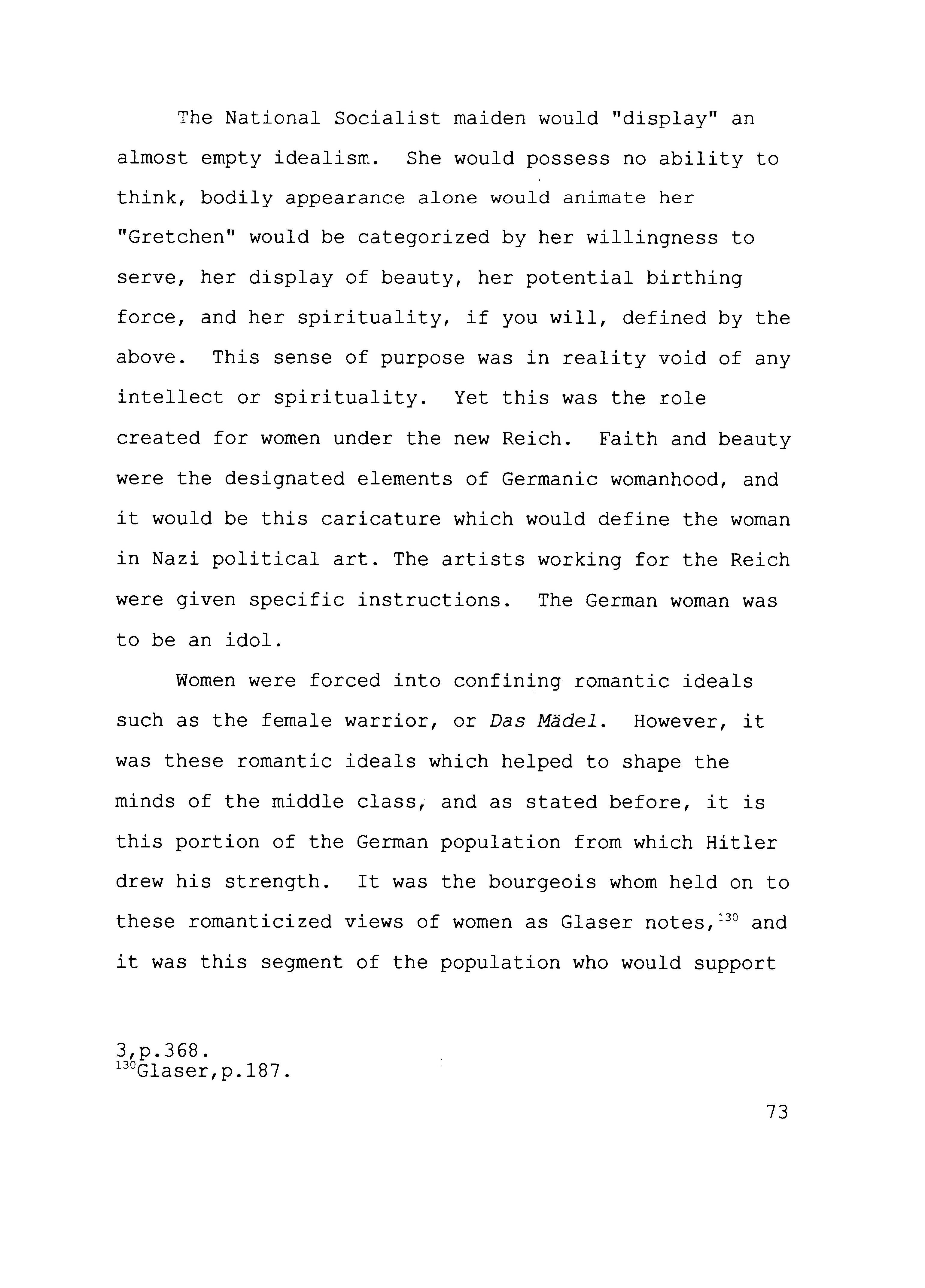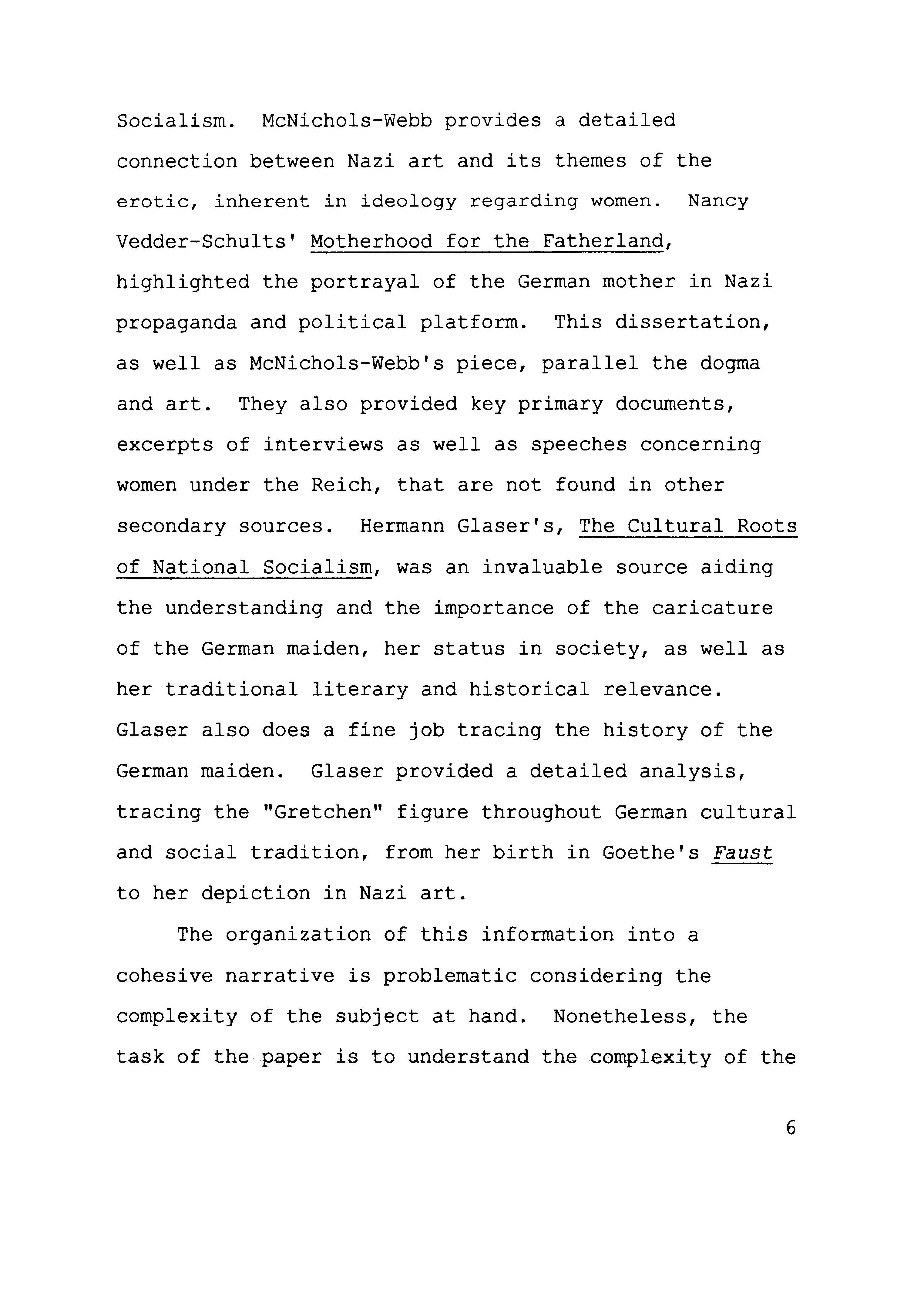 Socialism. McNichols-Webb provides a detailed connection between Nazi art and its themes of the erotic, inherent in ideology regarding women. Nancy Vedder-Schults' Motherhood for the Fatherland, highlighted the portrayal of the German mother in Nazi propaganda and political platform. This dissertation, as well as McNichols-Webb's piece, parallel the dogma and art. They also provided key primary documents, excerpts of interviews as well as speeches concerning women under the Reich, that are not found in other secondary sources. Hermann Glaser's, The Cultural Roots of National Socialism, was an invaluable source aiding the understanding and the importance of the caricature of the German maiden, her status in society, as well as her traditional literary and historical relevance. Glaser also does a fine job tracing the history of the German maiden. Glaser provided a detailed analysis, tracing the "Gretchen" figure throughout German cultural and social tradition, from her birth in Goethe's Faust to her depiction in Nazi art.