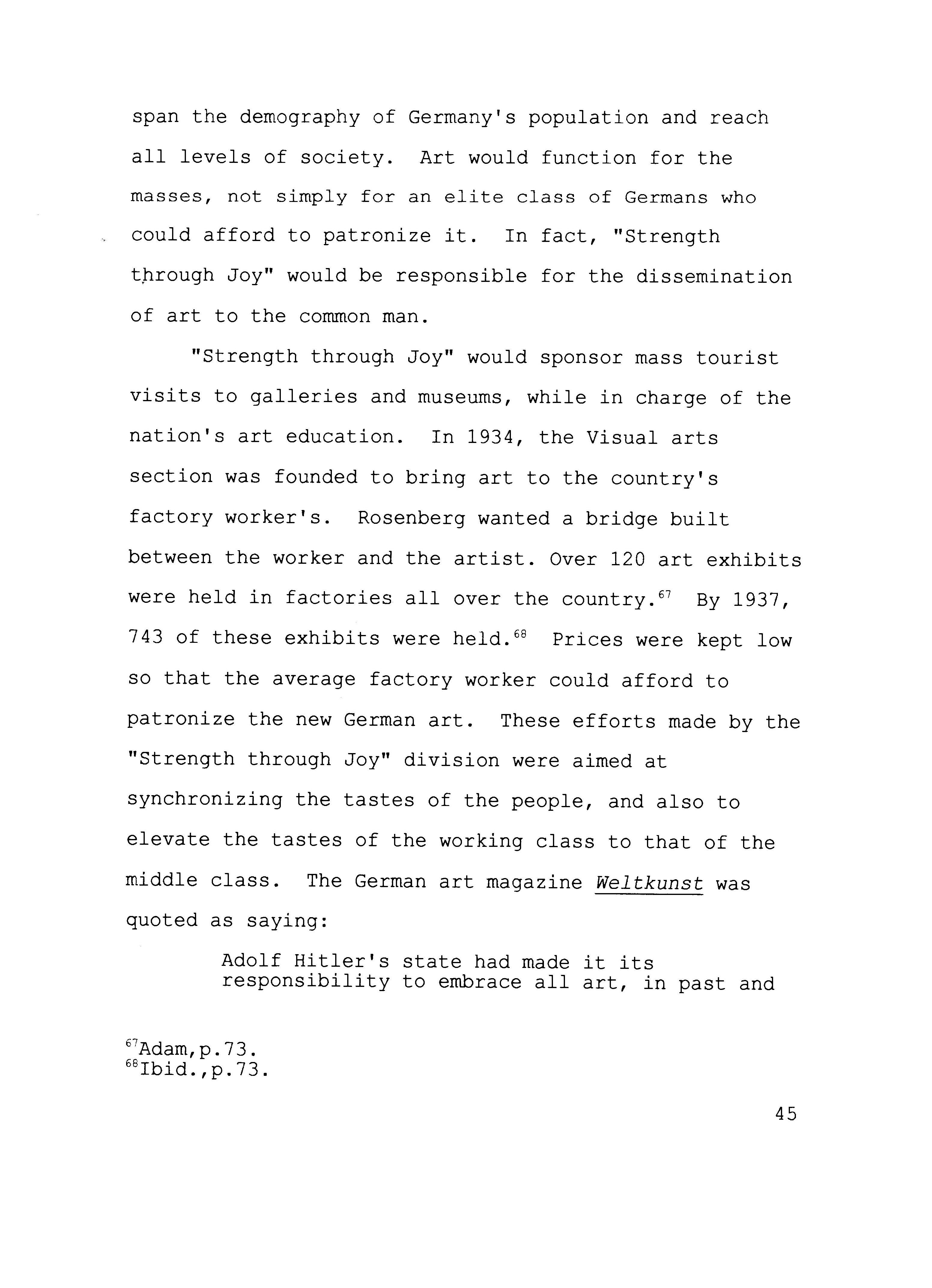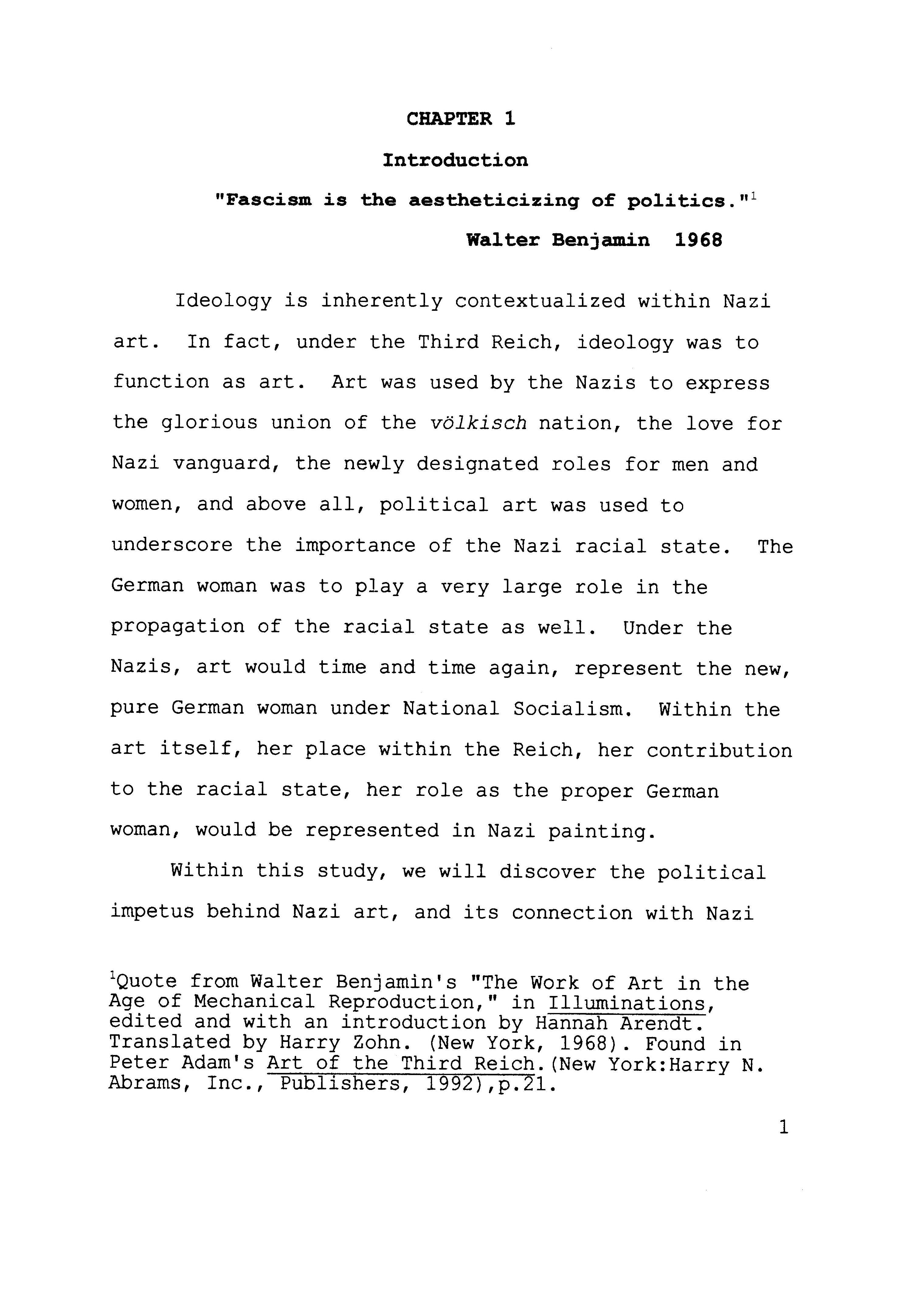 1 Quote from Walter Benjamin's "The Work of Art in the Age of Mechanical Reproduction," in Illuminations, edited and with an introduction by Hannah Arendt. Translated by Harry Zohn. (New York, 1968). Found in Peter Adam's Art of the Third Reich. (New York:Harry N. Abrams, Inc., Publishers, 1992),p.21.