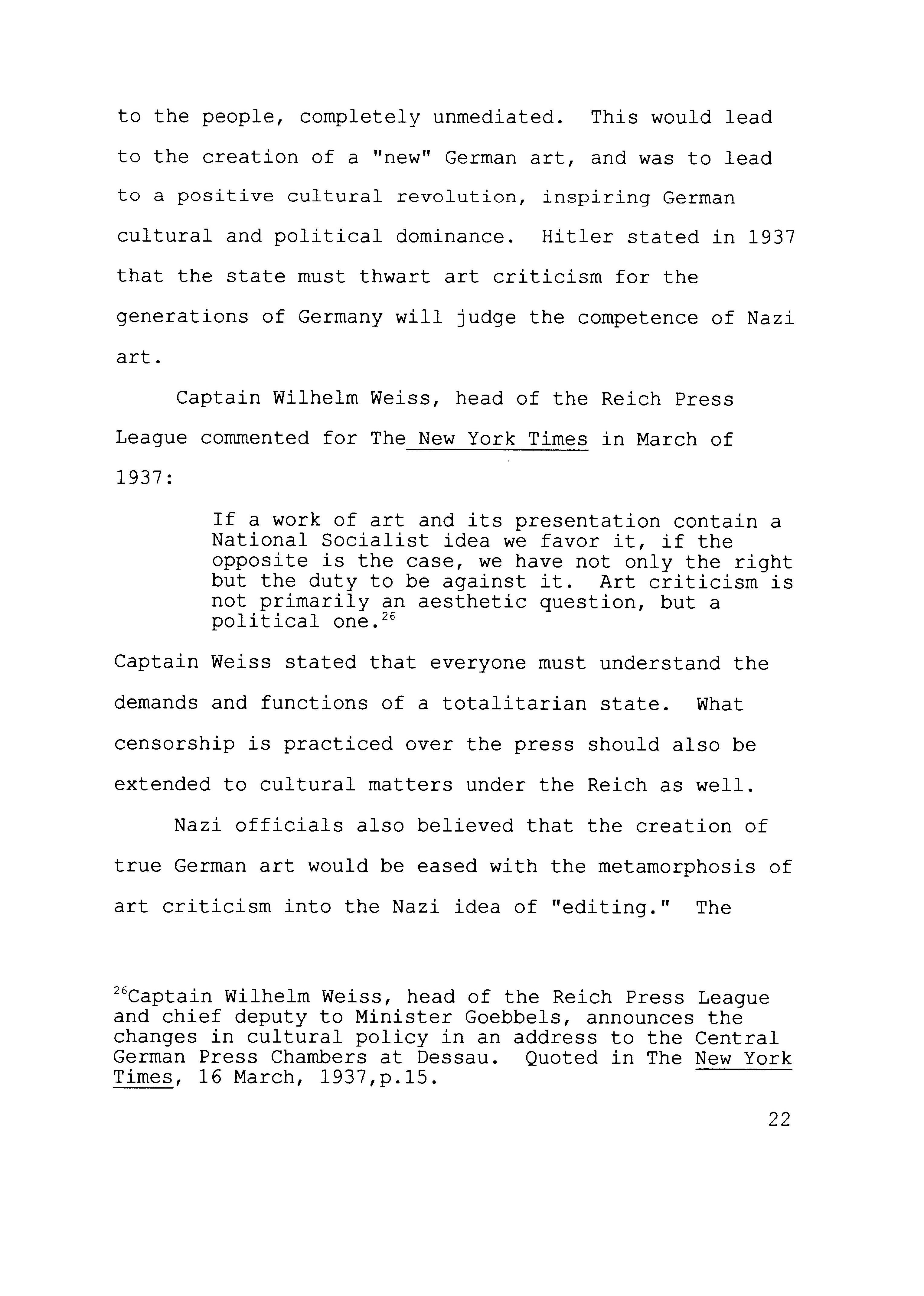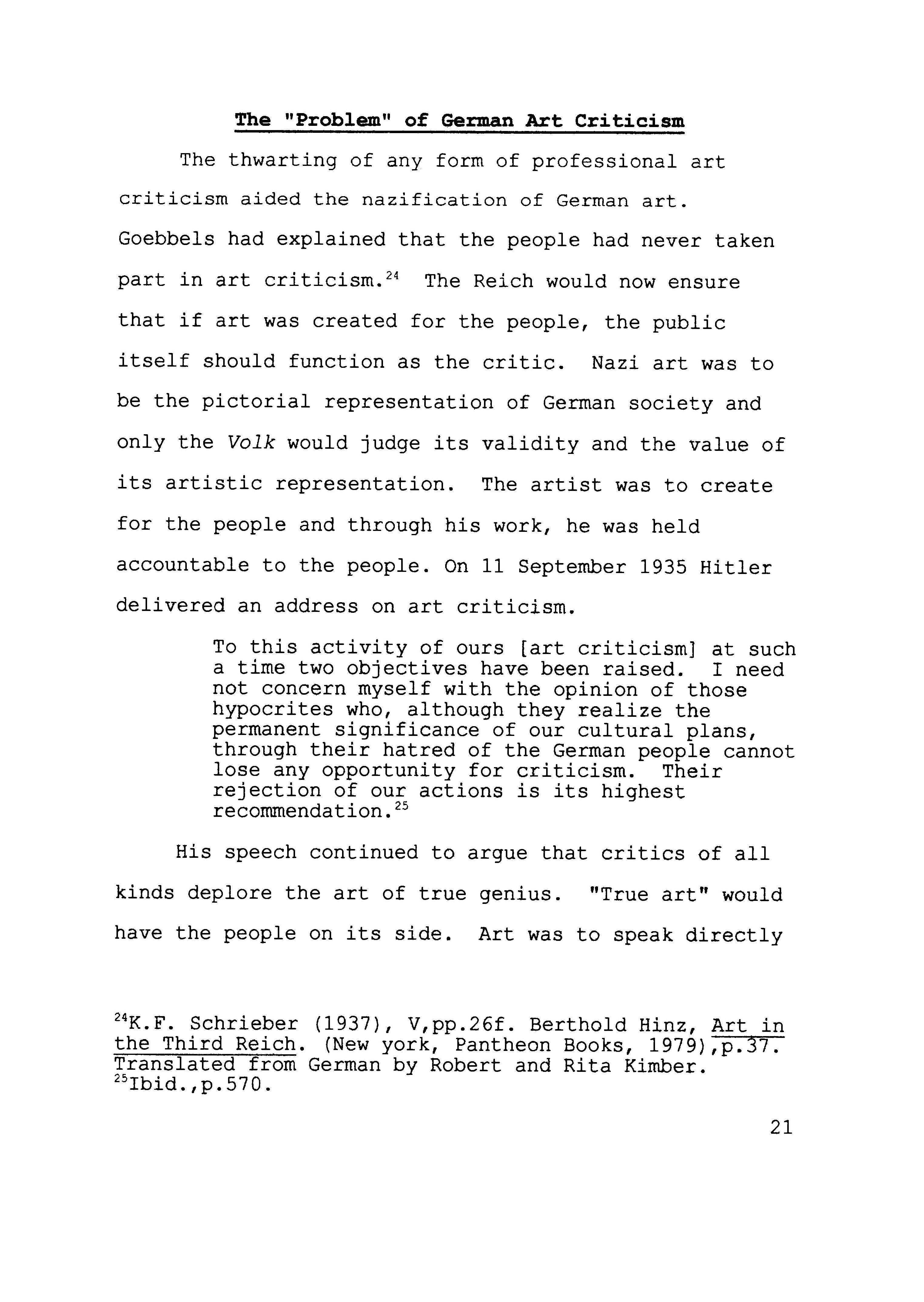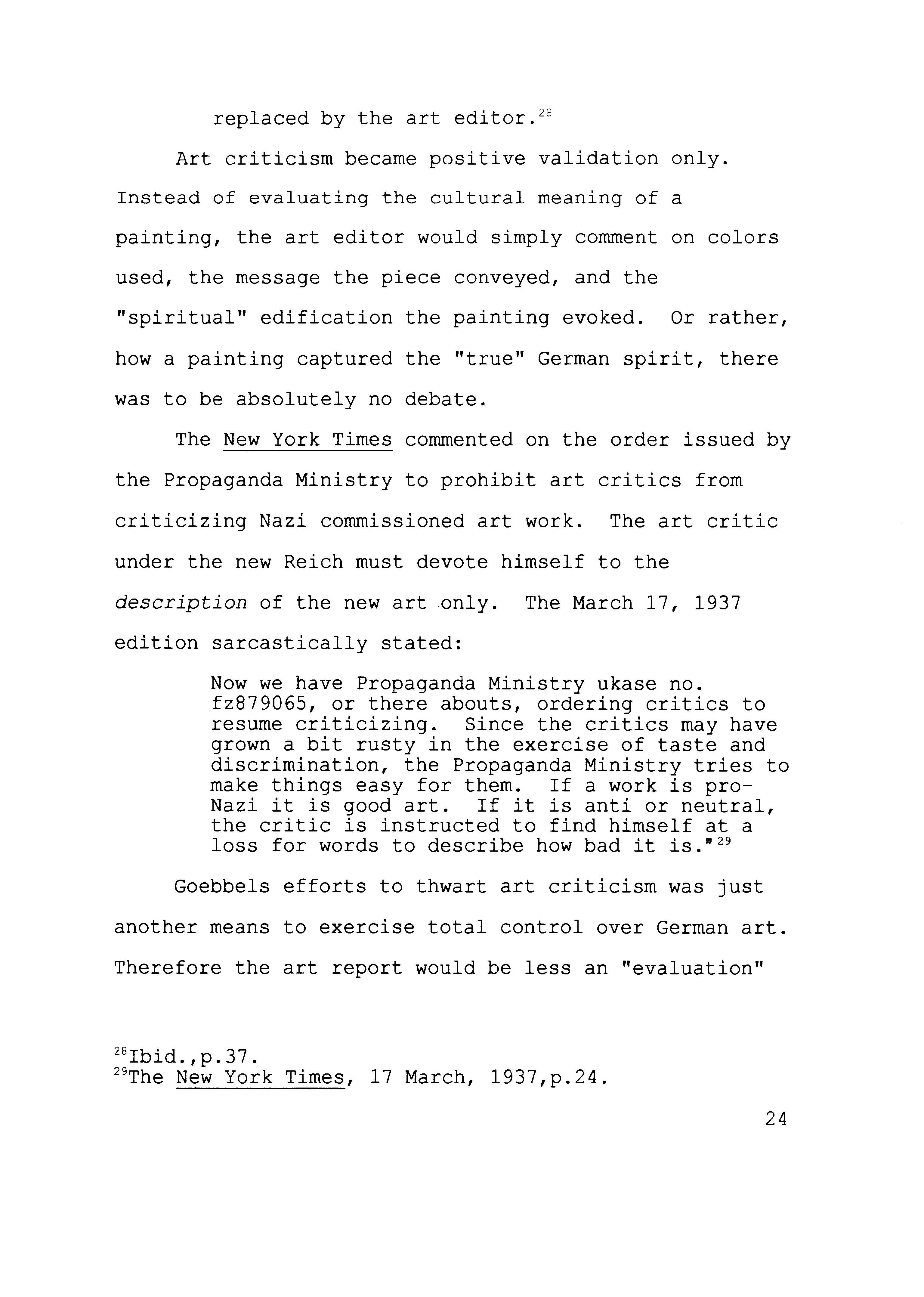 It was first necessary to understand the fervorent "cleansing" of the German art world initiated by the Nazis. The Nazis too effectively stamped out all forms of professional art criticism, and virtually changed the function of the art critic to art editor. The