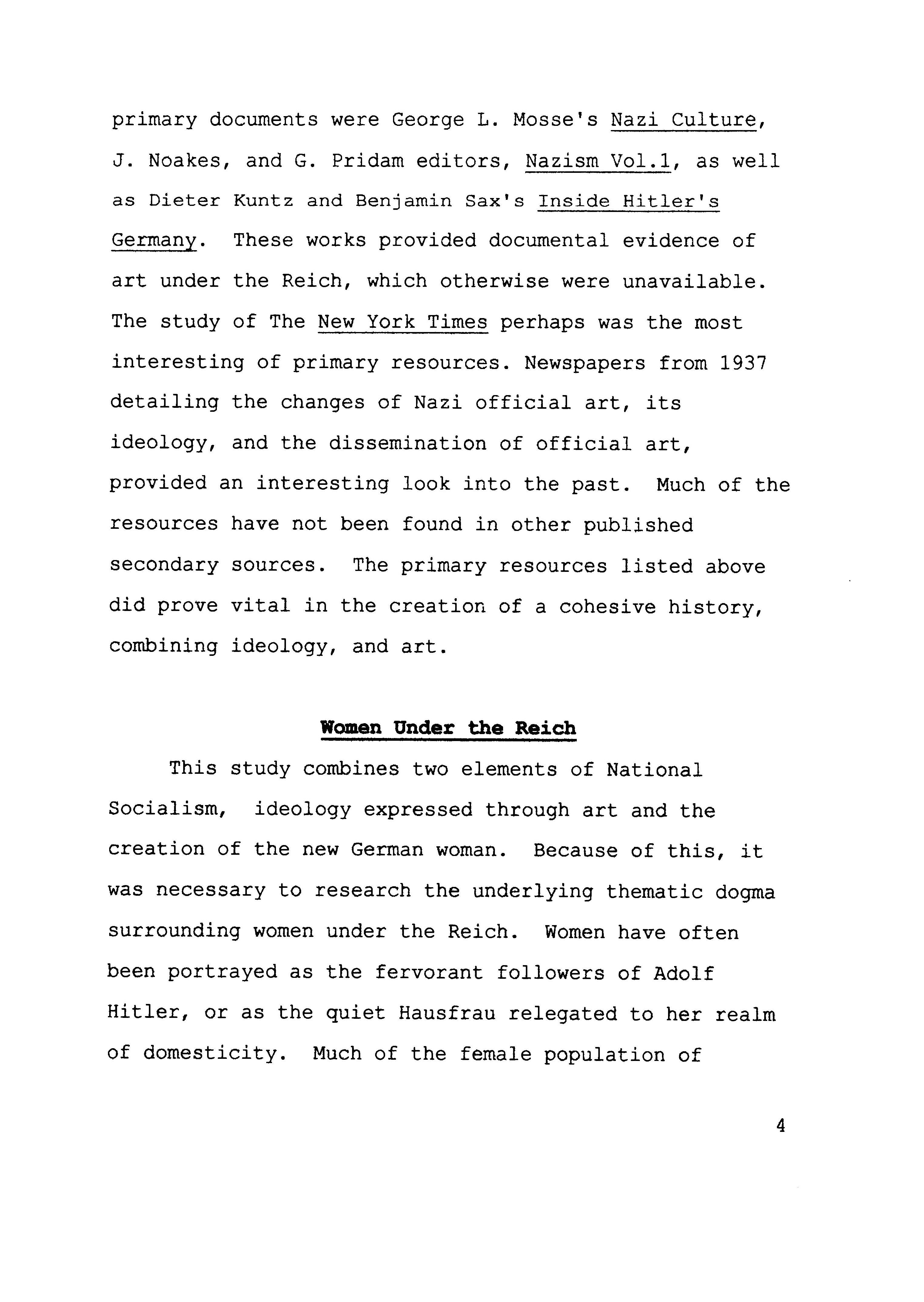 primary documents were George L. Mosse's Nazi Culture, J. Noakes, and G. Pridam editors, Nazism Vol.1, as well as Dieter Kuntz and Benjamin Sax's Inside Hitler's Germany. These works provided documental evidence of art under the Reich, which otherwise were unavailable. The study of The New York Times perhaps was the most interesting of primary resources. Newspapers from 1937 detailing the changes of Nazi official art, its ideology, and the dissemination of official art, provided an interesting look into the past. Much of the resources have not been found in other published secondary sources. The primary resources listed above did prove vital in the creation of a cohesive history, combining ideology, and art.