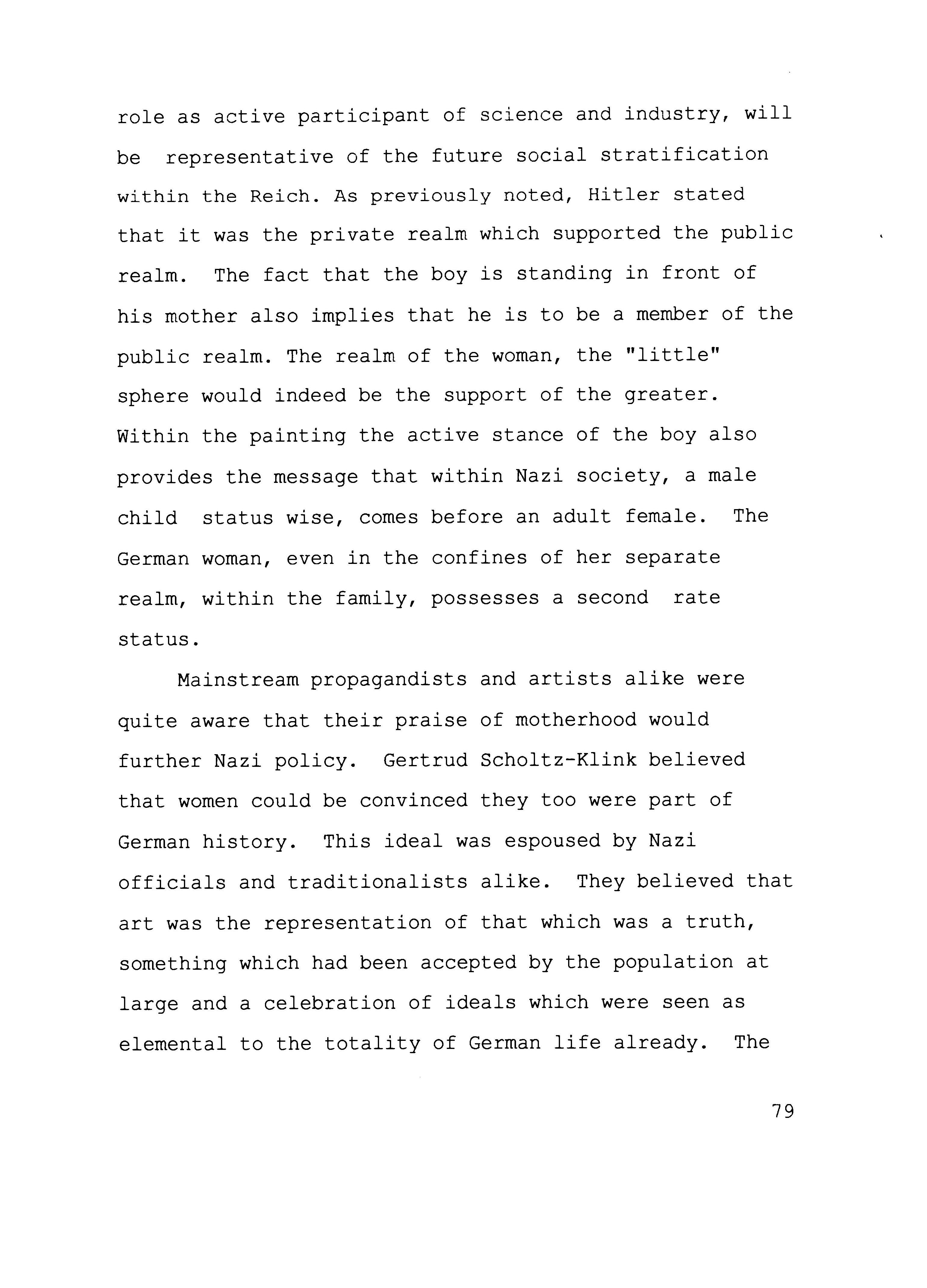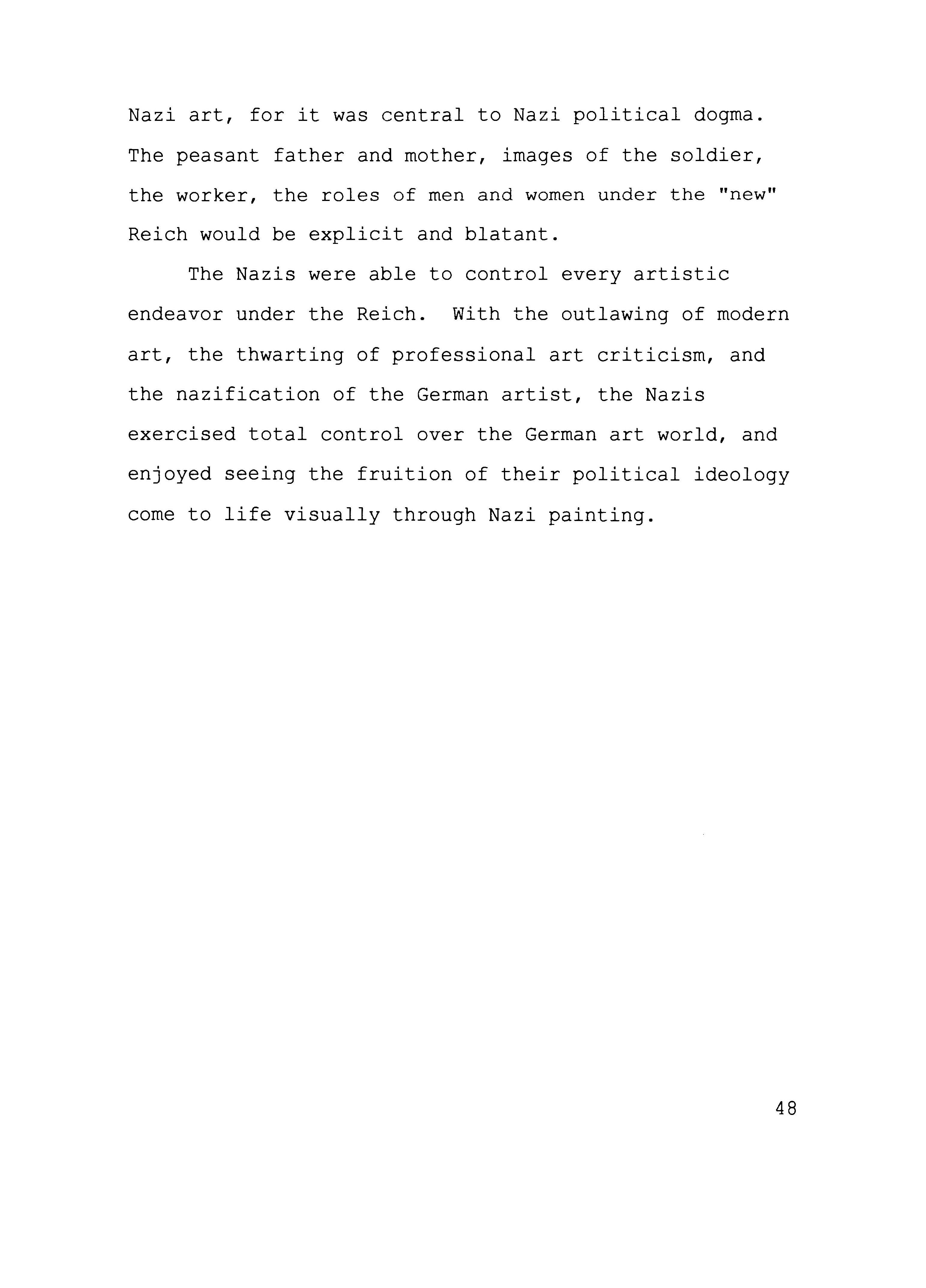 pictorial representation of the German woman under the Third Reich. However, to understand the contextual relevance of women in Nazi art, there first must be an understanding of Nazi political dogma regarding women, as was discussed. We must understand that her role and her status within German society was in fact entirely dependent upon Nazi dogma. The actual paintings themselves are not merely German maidens frolicking through the greater German landscape, they are much more. Because Nazi politics made up the contextual relevance within the art itself, it is imperative that women's role within German society be discussed. Woman's role within Nazi society must be placed within a larger thematic context. An overall chapter regarding the politics of Nazi art, and the turmoil within the German art world experienced after 1933, provides the larger setting. Therefore, the image of women in art will provide an exemplary function for Nazi political art in general.