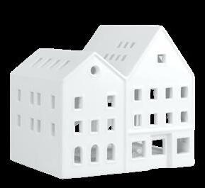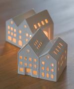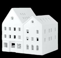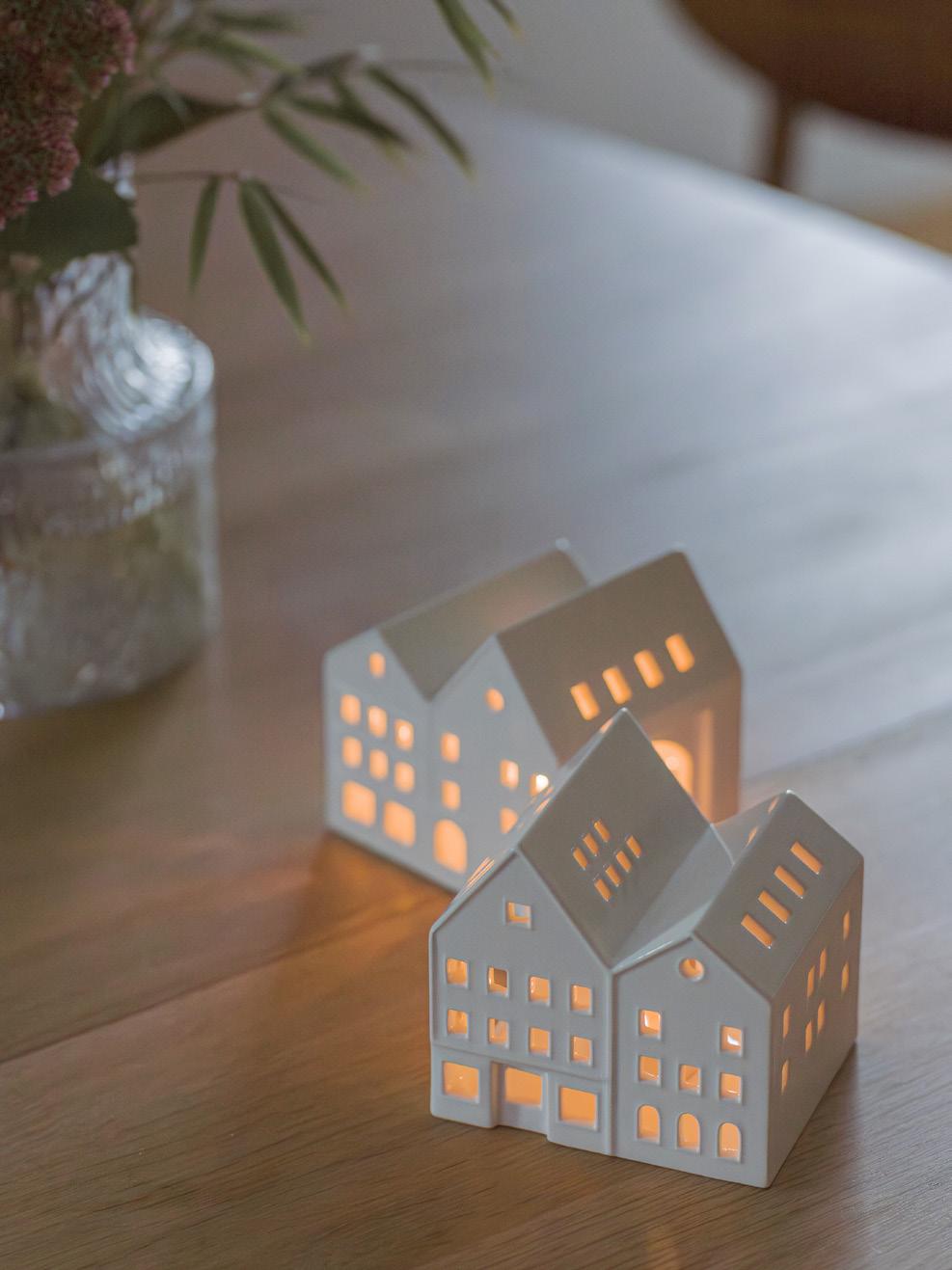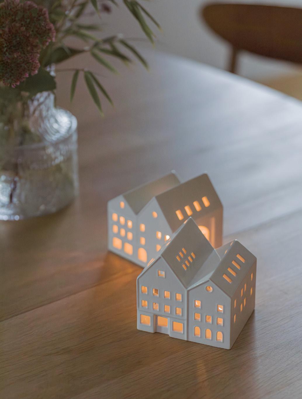 Lyshuset er laget i keramikk og gjengir de smale fasadene og detaljene som kjennetegner bryggehusene. Når et telys tennes inni, lyser vinduene opp og gir et varmt og stemningsfullt uttrykk. Lyshuset har ulik fasade på for- og bakside, og to lyshus kan dermed gi 4 ulike kombinasjoner av fasader.