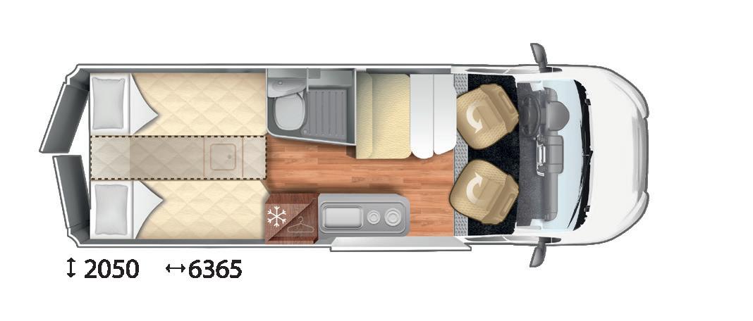 S= standard O=optional CHASSIS MECHANICAL UNIT FIAT DUCATO ENGINE 2.2 MJ POWER 140 HK HD MAXIMUM TECHNICALLY PERMISSIBLE WEIGHT (KG) 3500 WEIGHT UNLADEN IN RUNNING CONDITIONS MIN / MAX (KG) 2905 / 3165 ADDITIONAL EQUIPMENT (KG) 32 WHEELBASE (MM) 4035 MAXIMUM TOWABLE WEIGHT (KG) 2500 WHEELS DIMENSIONS 15" MANUAL AIR CONDITIONING S DRIVER AND PASSENGER AIRBAG S / S CRUISE CONTROL WITH SPEED LIMITER S ABS / ESC S / S SWIVELLING DRIVER' AND PASSENGER'S SEAT S CAB SEAT COVERS S PAINTED CAB WHITE PLEATED CAB CURTAIN S DAB USB BLUETOOTH RADIO 9'' WITH ANDROID AUTO / APPLE CARPLAY O REAR VIEW CAMERA O DIMENSIONS AND PLACES BERTHS 2 (+1) REAR BED (CM) 1950X800 - 1860X800 SUPPLEMENTARY BED IN DINETTE S DIMENSIONS SUPPLEMENTARY BED IN DINETTE (CM) 1560 X 950(500) BEDS WITH STAVES S SKYLIGHT PANORAMIC SKYLIGHT 700X500 MM WITH BLIND AND MOSQUITO NET S 400X400 MM SKYLIGHT S OPENABLE REAR WINDOWS S DOUBLE-GLAZED WINDOWS WITH BLIND / MOSQUITO NET S INSTALLATIONS BURNERS 2 TANK CAPACITY : CLEAR WATER / WASTEWATER (L) 85(20) / 90 COMPRESSOR FRIDGE (L) 70 STANDARD HEATING SYSTEM 4000 KW GAS SPACE FOR 2 GAS BOTTLES (TOT. MAX 7 KG) S BATHROOM WINDOW (DOUBLE OPAQUE GLASS) S INTERNAL INSULATION MATERIAL POLYURETHANE FOAM FLOOR THICKNESS MIN / MAX (MM) 36 EQUIPMENTS LIFTING ROOF WITH INTEGRATED DOUBLE BED O STOWAGE ABOVE THE CABIN / OPEN SPACE CABIN S /CAB CARPET S TABLE EXTENSIONS IN DINETTE S FOLDING TABLE S STORAGE UNDER THE DINETTE TABLEENTRANCE DOOR FLYSCREEN S ELECTRIC STEP S SOLAR PANEL O AWNING O BLACK FRONT GRILLE, BLACK SKID PLATE, BLACK HEADLIGHT SURROUND O TECHNO TRIM O LEATHER STEERING WHEEL AND KNOB O INTERNAL LED LIGHTENING S EXTERIORS EXTERNAL LED LIGHT O 4 2+1 4