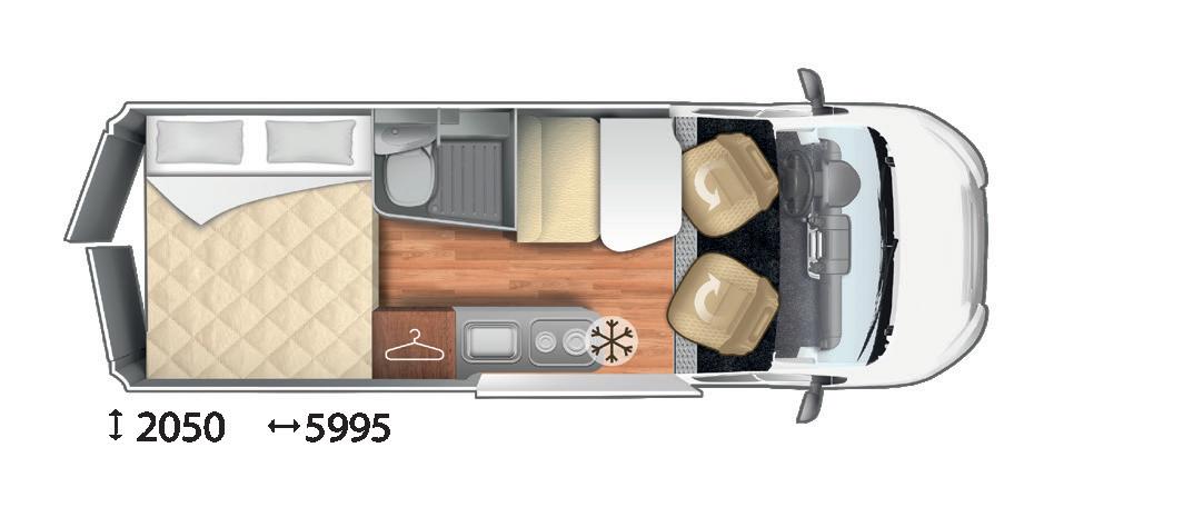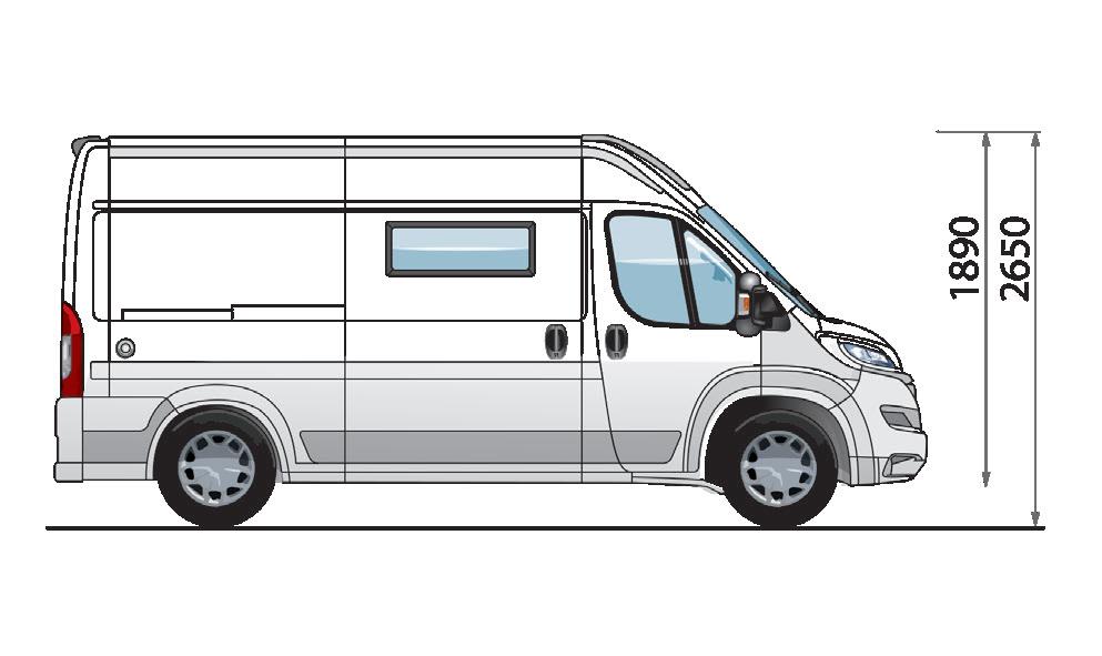S= standard O=optional CHASSIS MECHANICAL UNIT FIAT DUCATO ENGINE 2.2 MJ POWER 140 HK HD MAXIMUM TECHNICALLY PERMISSIBLE WEIGHT (KG) 3300 WEIGHT UNLADEN IN RUNNING CONDITIONS MIN / MAX (KG) 2795 / 2975 ADDITIONAL EQUIPMENT (KG) 32 WHEELBASE (MM) 4035 MAXIMUM TOWABLE WEIGHT (KG) 2500 WHEELS DIMENSIONS 15" MANUAL AIR CONDITIONING S DRIVER AND PASSENGER AIRBAG S / S CRUISE CONTROL WITH SPEED LIMITER S ABS / ESC S / S SWIVELLING DRIVER' AND PASSENGER'S SEAT S CAB SEAT COVERS S PAINTED CAB WHITE PLEATED CAB CURTAIN S DAB USB BLUETOOTH RADIO 9'' WITH ANDROID AUTO / APPLE CARPLAY O REAR VIEW CAMERA O DIMENSIONS AND PLACES BERTHS 2 (+1) REAR BED (CM) 186 X 149 SUPPLEMENTARY BED IN DINETTE S DIMENSIONS SUPPLEMENTARY BED IN DINETTE (CM) 160 X 95(50) BEDS WITH STAVES S SKYLIGHT PANORAMIC SKYLIGHT 700X500 MM WITH BLIND AND MOSQUITO NET S 400X400 MM SKYLIGHT S OPENABLE REAR WINDOWS S DOUBLE-GLAZED WINDOWS WITH BLIND / MOSQUITO NET S INSTALLATIONS BURNERS 2 TANK CAPACITY : CLEAR WATER / WASTEWATER (L) 85(20) / 90 COMPRESSOR FRIDGE (L) 70 STANDARD HEATING SYSTEM 4000 KW GAS SPACE FOR 2 GAS BOTTLES (TOT. MAX 7 KG) S BATHROOM WINDOW (DOUBLE OPAQUE GLASS) S INTERNAL INSULATION MATERIAL POLYURETHANE FOAM FLOOR THICKNESS MIN / MAX (MM) 36 EQUIPMENTS LIFTING ROOF WITH INTEGRATED DOUBLE BED O STOWAGE ABOVE THE CABIN / OPEN SPACE CABIN S /CAB CARPET S TABLE EXTENSIONS IN DINETTE S FOLDING TABLE S STORAGE UNDER THE DINETTE TABLEENTRANCE DOOR FLYSCREEN S ELECTRIC STEP S SOLAR PANEL O AWNING O BLACK FRONT GRILLE, BLACK SKID PLATE, BLACK HEADLIGHT SURROUND O TECHNO TRIM O LEATHER STEERING WHEEL AND KNOB O INTERNAL LED LIGHTENING S EXTERIORS EXTERNAL LED LIGHT O 4 2+1 4