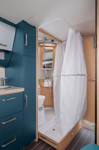 Innovativt duschdraperi med luftkammare. Man vet hur det är, det våta duschdraperiet i husvagnen söker ständigt kroppskontakt. I vårt kompaktbadrum förhindras det av en integrerad luftkammare som ger duschdraperiet form och håller det borta från kroppen (tillval).