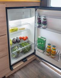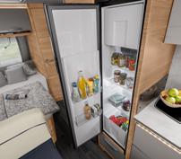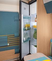 I det långsgående köket installeras det stora kylskåpet med dubbelhängning separat bredvid pentryt. I ugnen (tillval) kan man grädda frukostfrallorna.