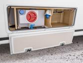 Praktisk servicebox. I alla KNAUS husvagnar placeras den så att den dras frostskyddat med värmesystemet. I serviceboxen finns alla viktiga anslutningar centralt på ett ställe. Vi ser dessutom till att du kommer åt dem bekvämt genom luckan som är integrerad i sidoväggen.
