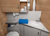 DESEO 400 TR. Det rymliga badrummet framme övertygar med detaljer som den fällbara klädstången, många avlastningsytor, ett förlängt tvättbord och en bänktoalett som rengörs enkelt.