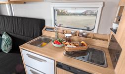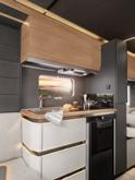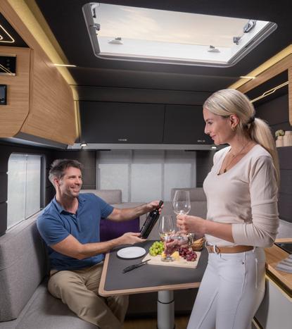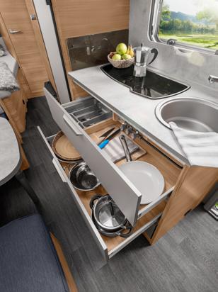 utnyttjas hela fordonsbredden, vilket maximerar förvaringsutrymmet och arbetsytan. Tack vare det enorma fönstret ovanför köksbänken uppstår en unik känsla av rymd.