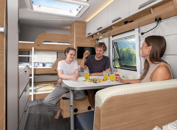 SPORT övertygar med mycket förvaringsutrymme och upp till 6 sovplatser genom våningssängen och den konverterbara sittgruppen. Då har alla sin egen säng och i badrummet finns tillräckligt med plats för handdukar, schampo osv.