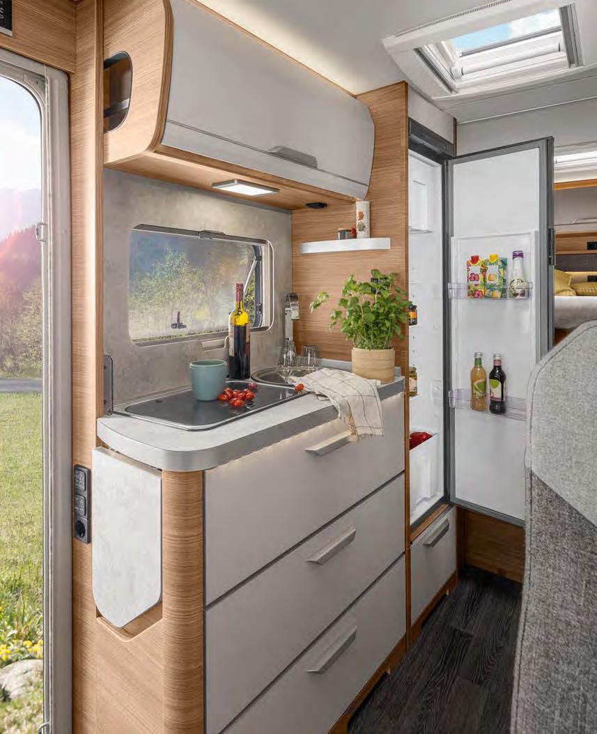 VAN I 550 MF. Med ett kylskåp (AES), rymliga lådor som kan dras ut helt och utfällbar extraskiva till arbetsytan är köket fullt utrustat trots de kompakta fordonsmåtten.