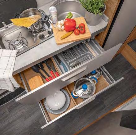 BOXDRIVE 680 ME. Gott om viktigt förvaringsutrymme. Det är extra generöst och lyxigt köket. Tack vare kullagrade lådor som kan dras ut helt kan man utnyttja all plats på sista millimetern.
