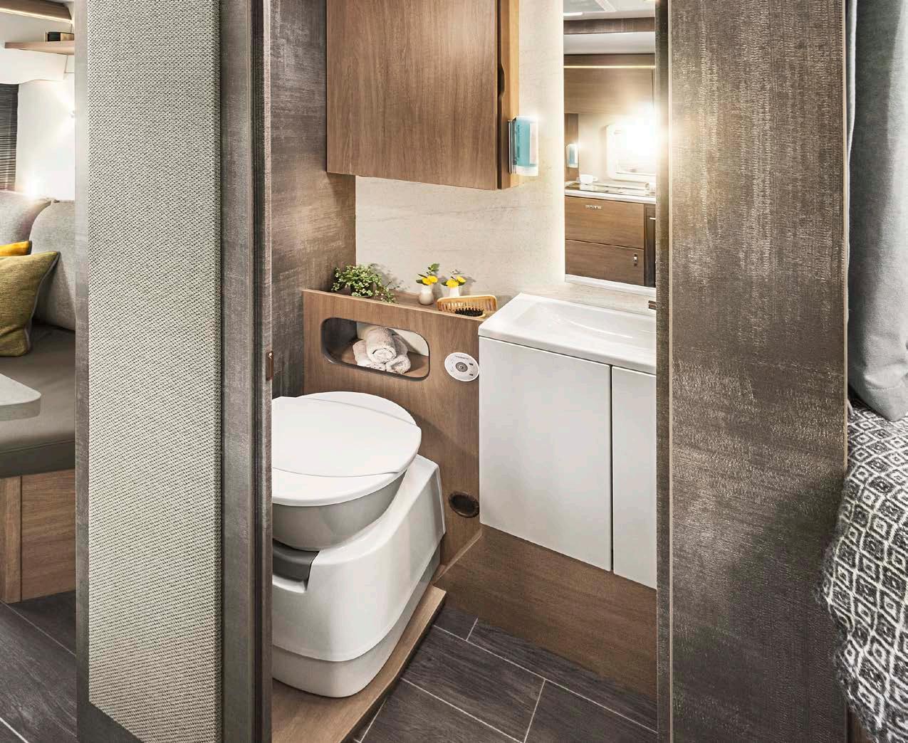 Intelligent integrerade överskåp, lådor och hyllor gör det enkelt för resenärer att hålla ordning utan ansträngning. Precis som i köket, skapar dagsljuset och den moderna inredningen i ljus ek med inslag av vitt en luftig atmosfär även i badrummet. Tillsammans med ytor som efterliknar skiffer, uppfyller inredningen de senaste designtrenderna samtidigt som den erbjuder maximal komfort för en fulländad semesterupplevelse – oavsett om det är kylskåpet eller den fullt utrustade TABBERT-duschen.