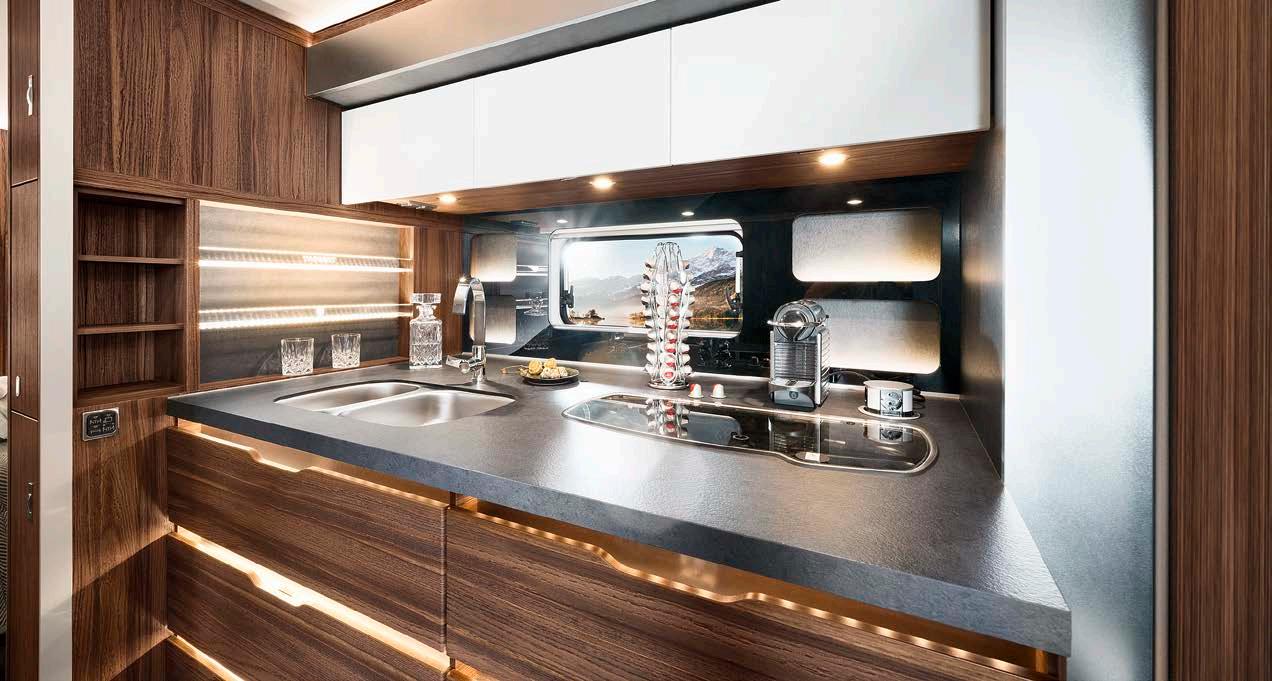 Inget är slumpmässigt. Användningen av olika dekorer på väggar, möbler och ytor SENARA kan alltid relateras till specifika syften och ändamål. En stor fotovägg med bakgrundsbelysning i bodelen leder blicken från en vägg till en annan, och tillåter dig att utforma myshörnan på ett helt personligt sätt. Det stilrena köket i SENARA, utformat med raka linjer enligt designkonceptet, tar en mer subtil roll med en övergripande harmonisk materialkombination. Dock med alla fördelar som förväntas av ett TABBERT-kök, inklusive en kombinerad gaspis med två brännare och diskho samt ett kylskåp. En annan integrerad och genomtänkt designdetalj är den uppfällbara extra arbetsytan (tillval), som möjliggör en enkel matlagningsupplevelse.