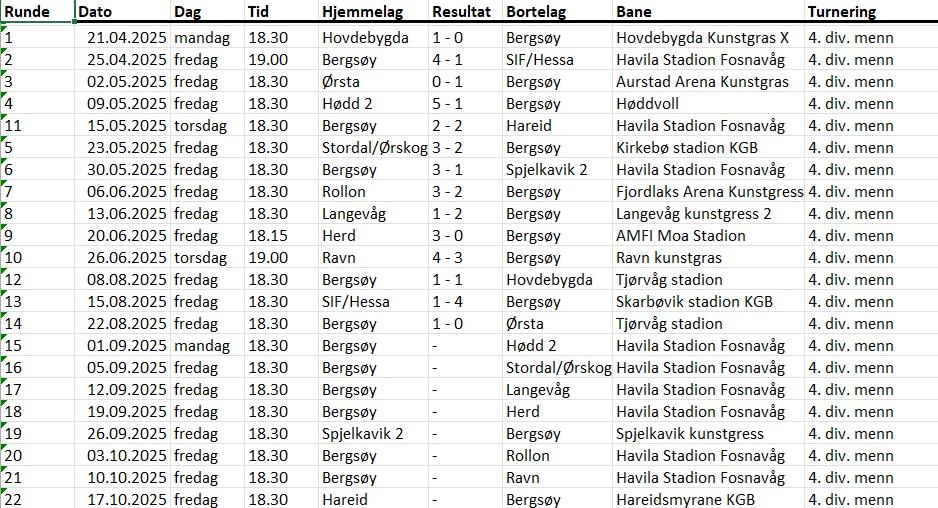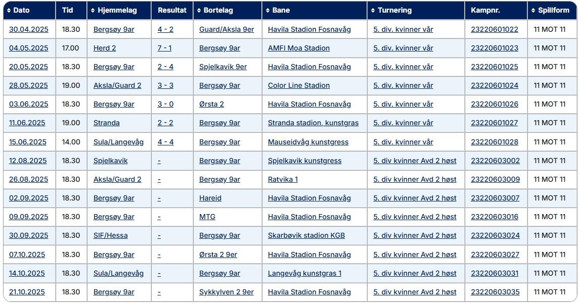 På 36 kampar har Bergsøy 13 sigerar, 8 uavgjort og 15 tap. 72-79 i målforskjell.