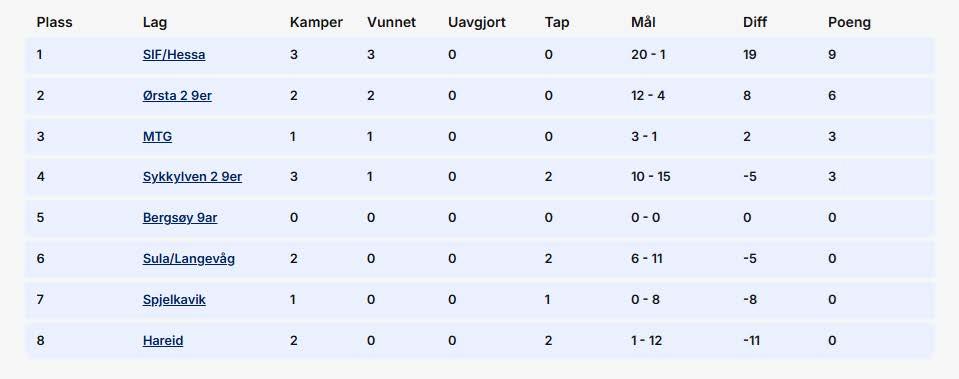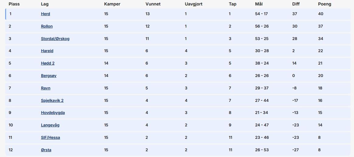 Hødd2 ligg på 5.plass på plassen over Bergsøy, og det er berre 1 poeng som skiller laga midt på tabellen.