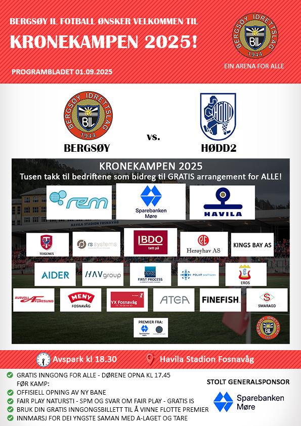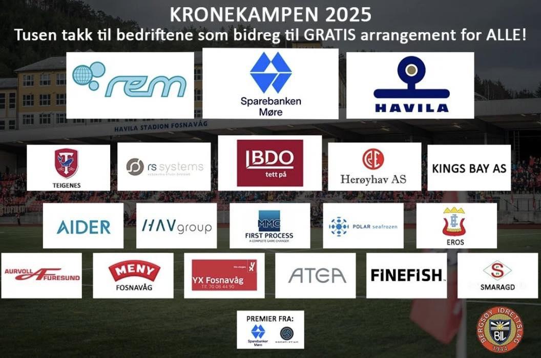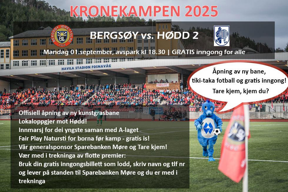 Vi i Bergsøy IL Fotball ønske å lage fotballfest på Havila Stadion Fosnavåg når naborival Hødd2 tek turen til oss på nytt banedekke! I den forbindelse arrangerer vi Kronekampen med gratis inngong for alle der Bergsøy IL Fotball spelar på lag med næringslivet. Bedrifter gir sitt bidrag i form av x antall kroner per tilskuar som kjem på kamp - jo fleire som kjem dess meir sponsar næringslivet Bergsøy IL Fotball!