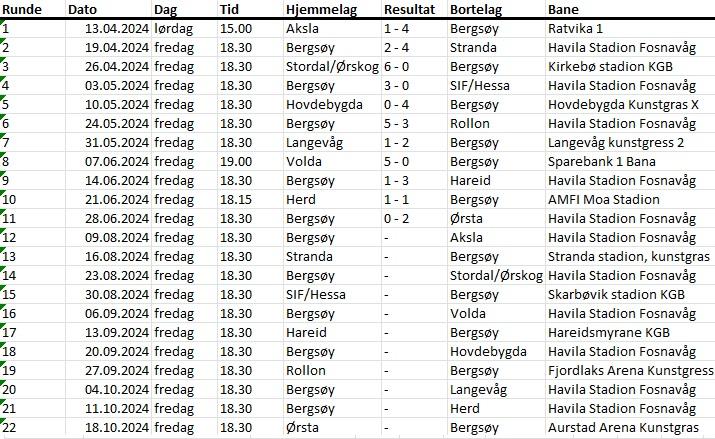 Idag starter sesongen på igjen for A-laget, og Aksla kjem til Havila Stadion. Aksla har på 10 kampar hittil tatt 7 poeng med to sigerar og 1 uavgjort, men tapt dei 7 andre kampane. Bergsøy står med 16 poeng etter 11 kampar med sine 5 sigerar, 1 uavgjort og 5 tap.