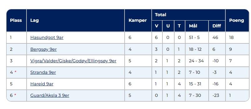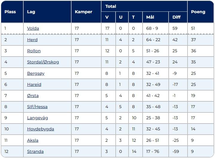 Bergsøy ligg på 5.plass med 25 poeng, mens Hovdebygda ligg på 10.plass med 14 poeng. Hovdebygda ligger tredje sist på tabellen berre fem poeng over bunnlaga Aksla og Stranda, og håper nok å sjå oppover på tabellen som også er ganske jamnt.