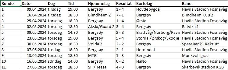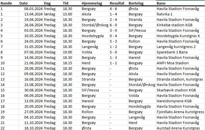 Terminliste og Tabell 2024 Bergsøy A-lag Dame