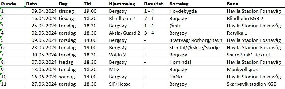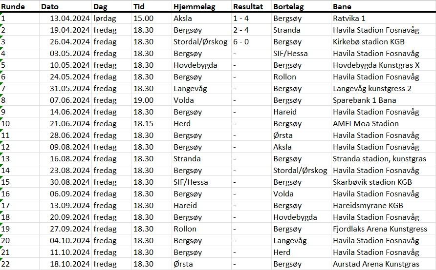 Terminliste og Tabell 2024 Bergsøy A-lag Dame