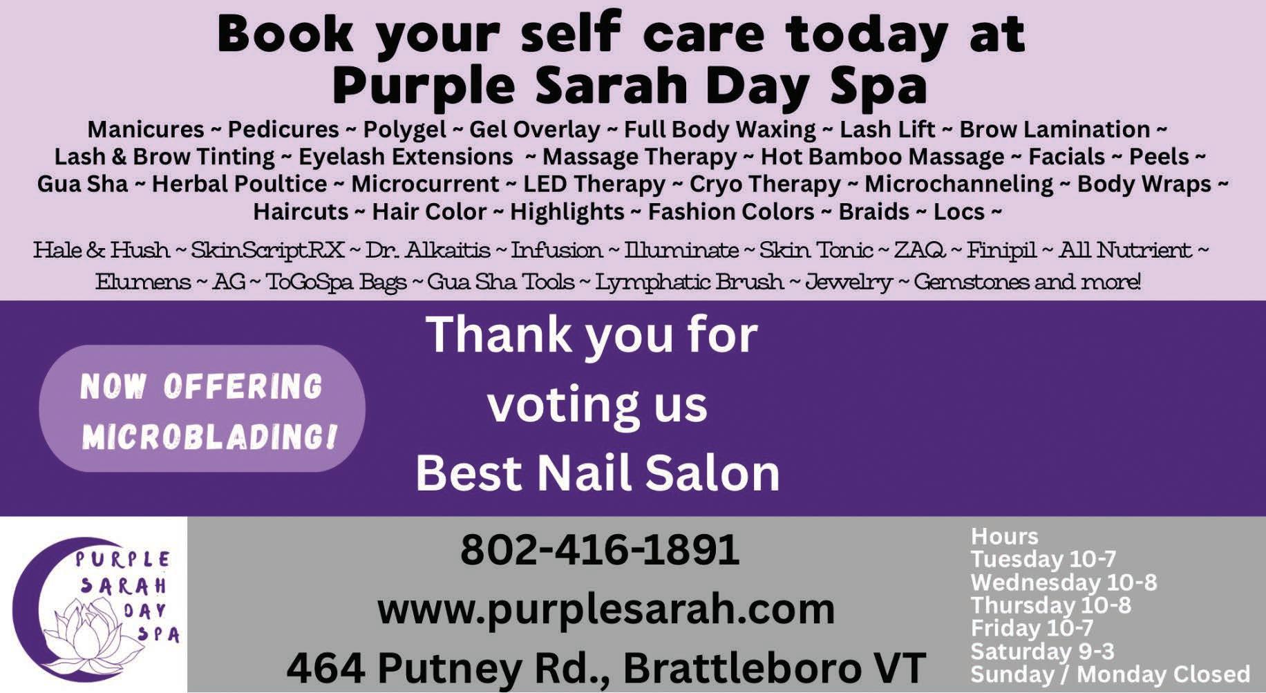 464 Putney Rd., Brattleboro 802-416-1891 purplesarah.com