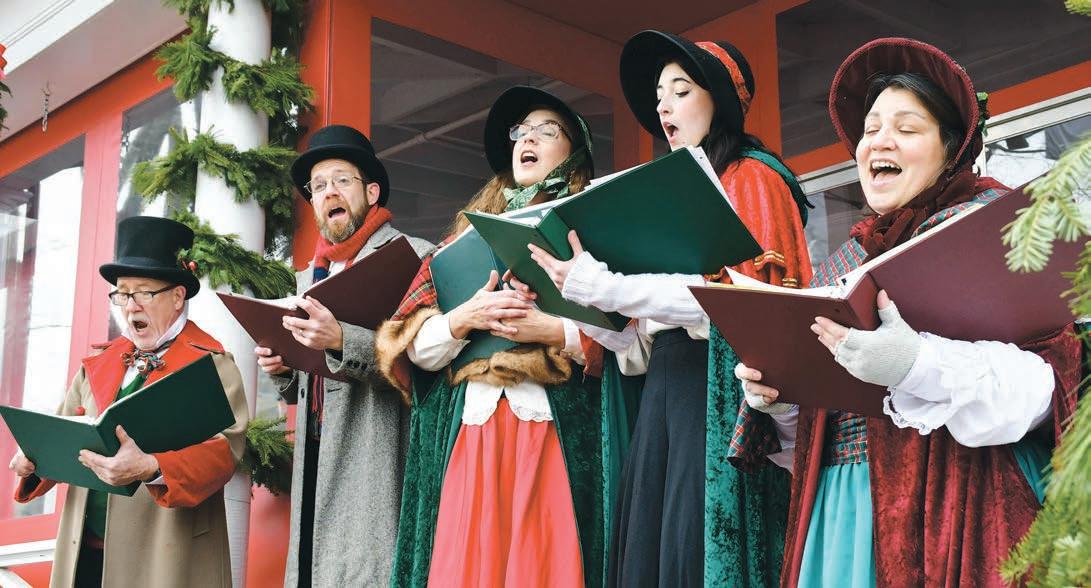 From left, John Demler, Matthew Passetto, Kara Demler, Teagan Demler and Jessica Passetto, The Berkshire Victorian Carolers, sing from the the porch of The Red Lion Inn at the 33rd annual Stockbridge Main Street at Christmas in 2022. The event celebrates Norman Rockwell’s painting of the village during the holidays.