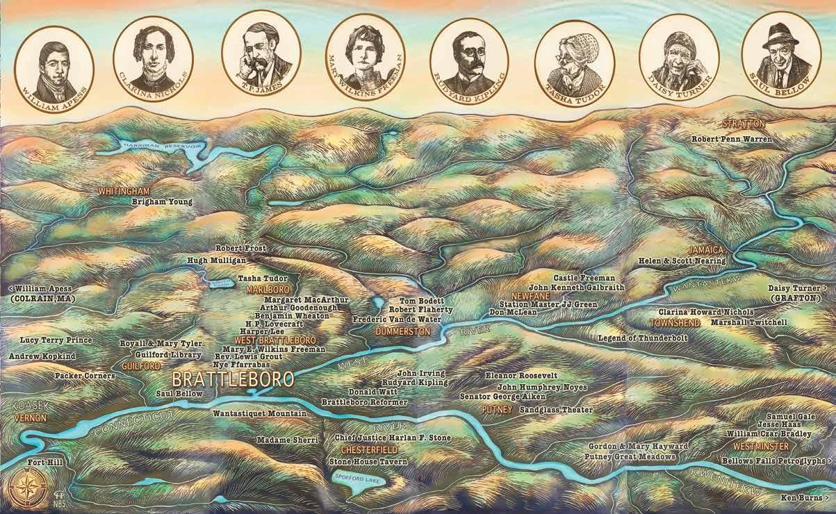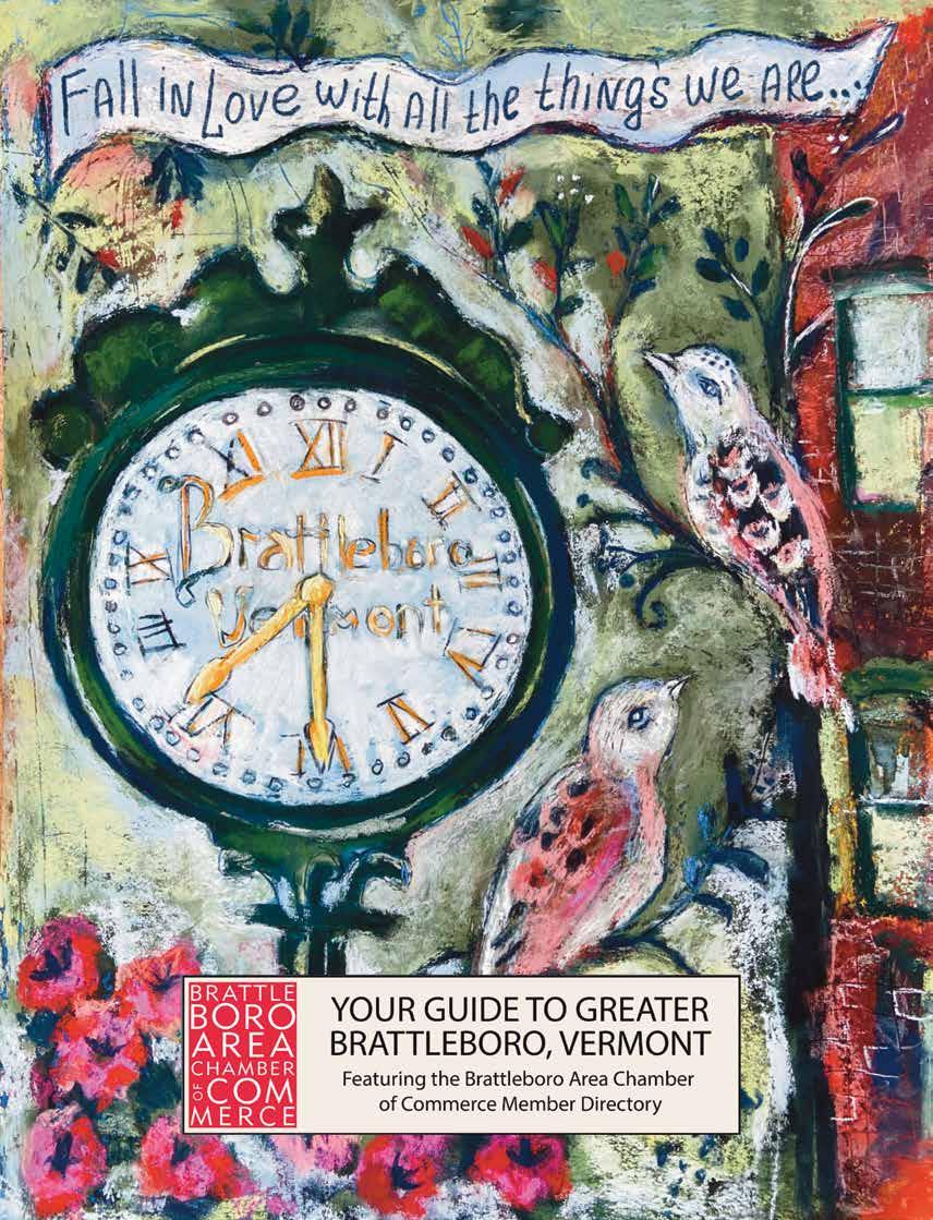 us a visit - and perhaps even call this eastern corner of Vermont, home. Within these pages you will discover all sorts of things to see, savor, relish, indulge in and return to experience again and again. The businesses represented in the yellow section in the back and highlighted throughout this guide are all members of this 117-year-old organization…may I say institution? If you’re not currently a member of Brattleboro Area Chamber of Commerce or will be setting up shop in the future, please consider joining us and becoming part of an ever growing, eclectic, vibrant and diverse business community. Enjoy! Our cover art was created by artist and jewelry maker Larisa Volkavichyute. She brings magic to life through her work with soft pastels. Her art offers a gentle and enchanting perspective on reality, captivating viewers with its ethereal charm. Additionally, Larisa is the creator of Leopard Frog Art shop in West Brattleboro, where she showcases her art alongside the work of other talented local artists. To explore her captivating world of art, visit www.leopardfrog.shop.