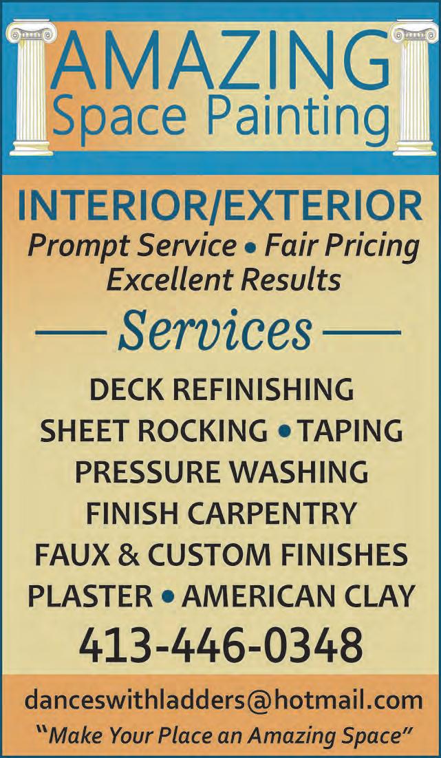 ESCOBAR'S PAINTING: Professional painter, over 25 years experience, surrounding areas. Interior and exterior painting, pressure washing of houses, decks, and fences. Fully insured, references available. Free estimates. 413-429-6333, 845-518-8609.