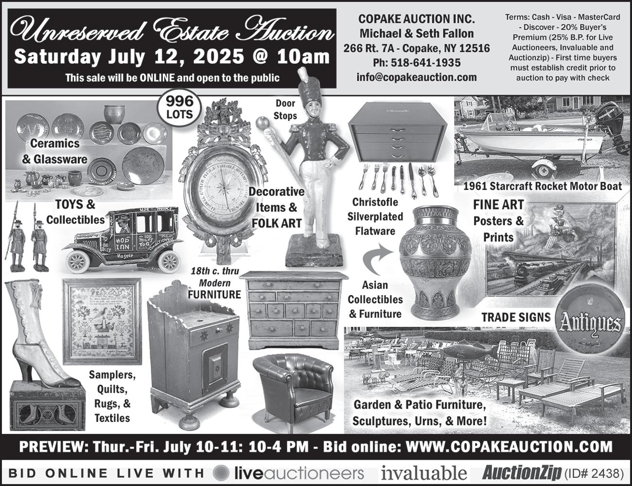 Liquidation Estate Sale: Sat. 7/12 (10a-4p) & Sun. 7/13 (10a-2p-50% off). 1698 Clayton Mill River Road, New Marlborough, MA, 01259 (Southfield). Thousands of tools, vintage metal toy collection (Hubley, Tonka, Ertl, etc.), Charlie McCarthy doll, full vintage kitchen (Pyrex, Corning, Etc.), farm implements, glass & ceramic, cheap furniture, old advertising, antiques, clothing, and tons of vintage items from decades past. Visit www.ber kshirelegacyestate.com to learn more and to join our mailing list for future sales and auctions!