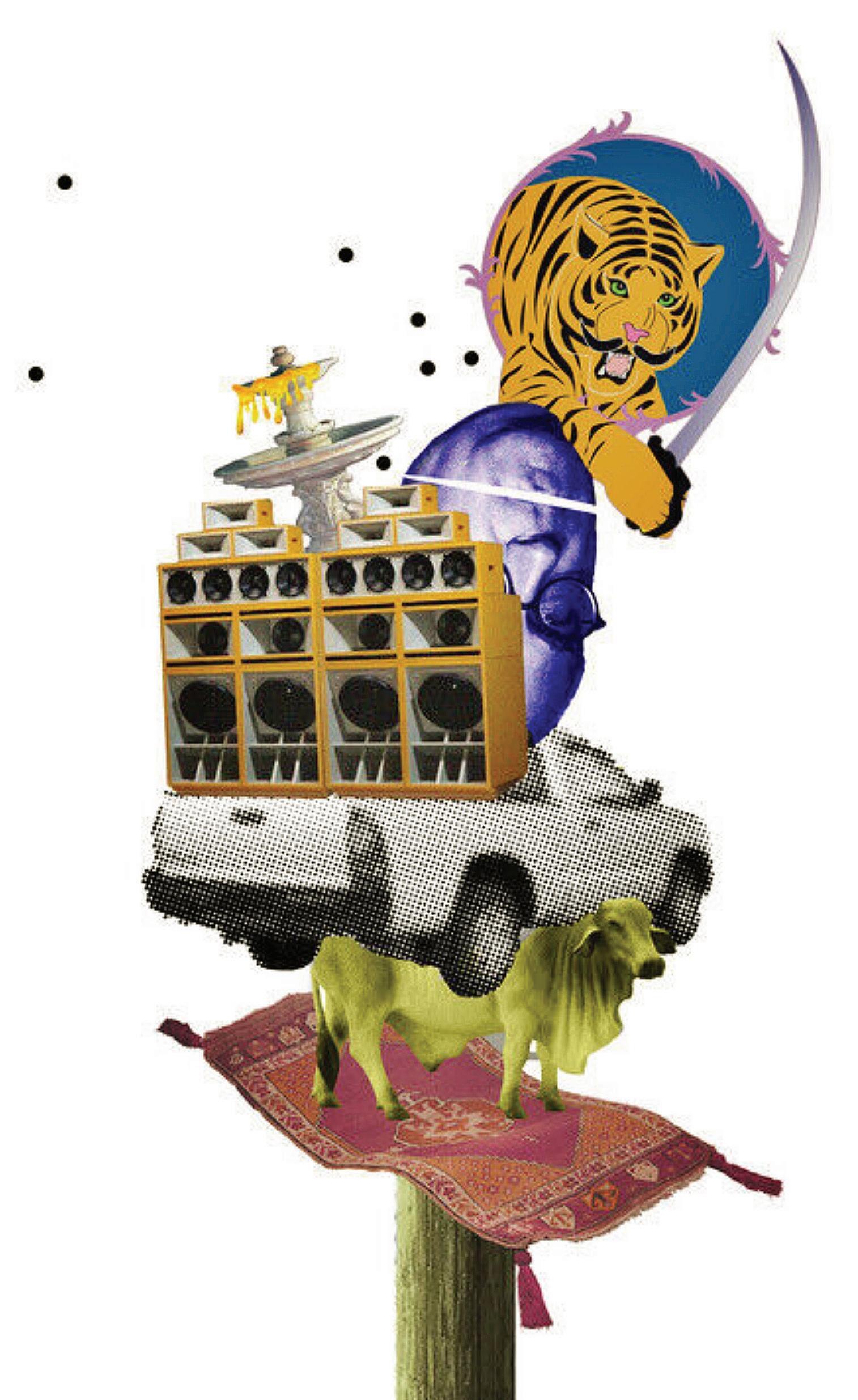 “Road to Hybridabad” reflects Khan’s own experience of identity formation — which, like “The Thousand and One Nights,” has been influenced by many histories and cultures — blending American, South Asian, Middle Eastern and Muslim lore and visual references.