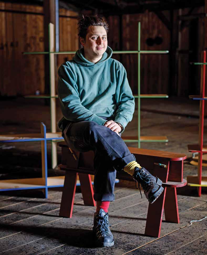 Furniture designer Lucca Zeray is in his sawdust-strewn studio at Pittsfield’s Wyandotte Woolen Mills, tracing the seams of his well-worn sweatshirt to illustrate the point that he is in the middle of making. The young creative has built a reputation in the design world for his relatively affordable and undeniably elegant flat-pack shelves, but his billable goods are just a part of a larger philosophy.