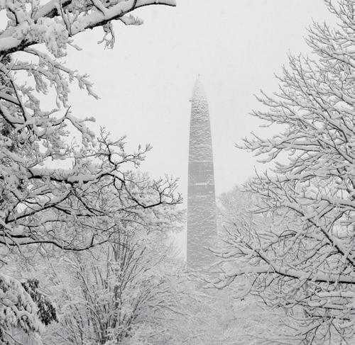 Snow covers the statue of John Stark at the Bennington Monument. Vermont Country file photo.